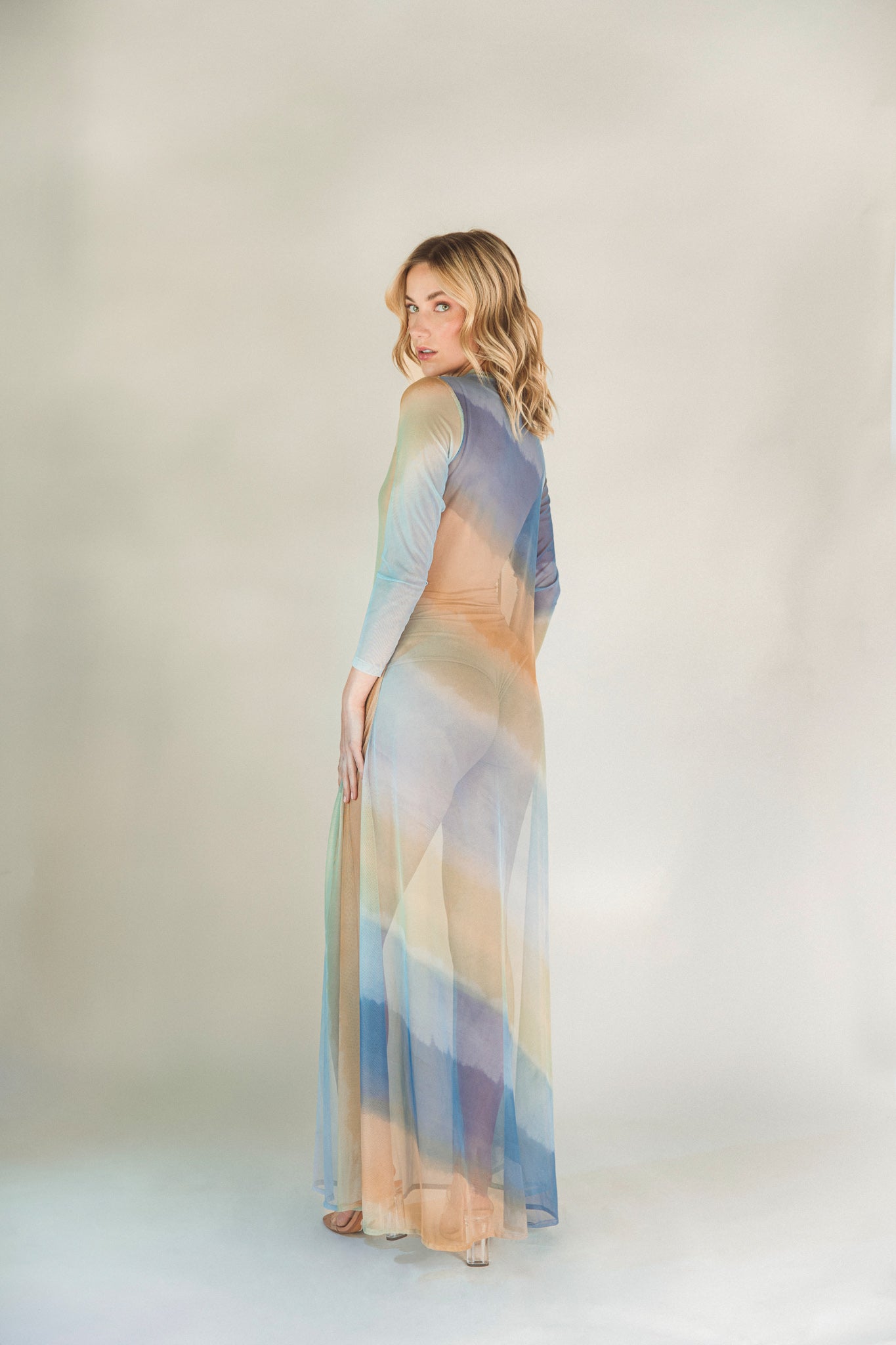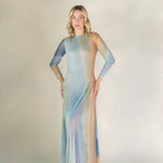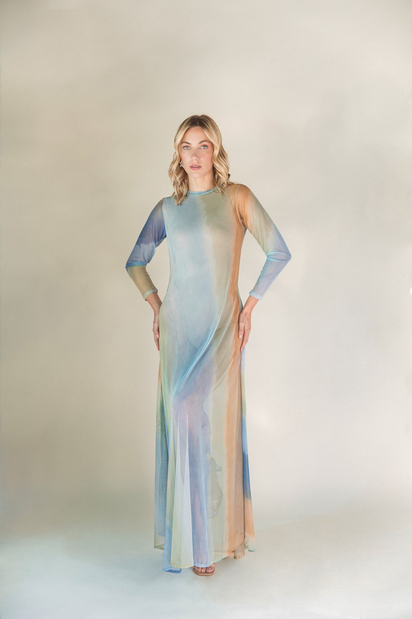 Long mesh dress with high neck and long sleeves. Its fluid and sheer silhouette makes it a sophisticated and versatile piece, ideal for layering.