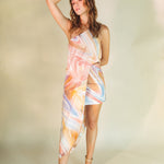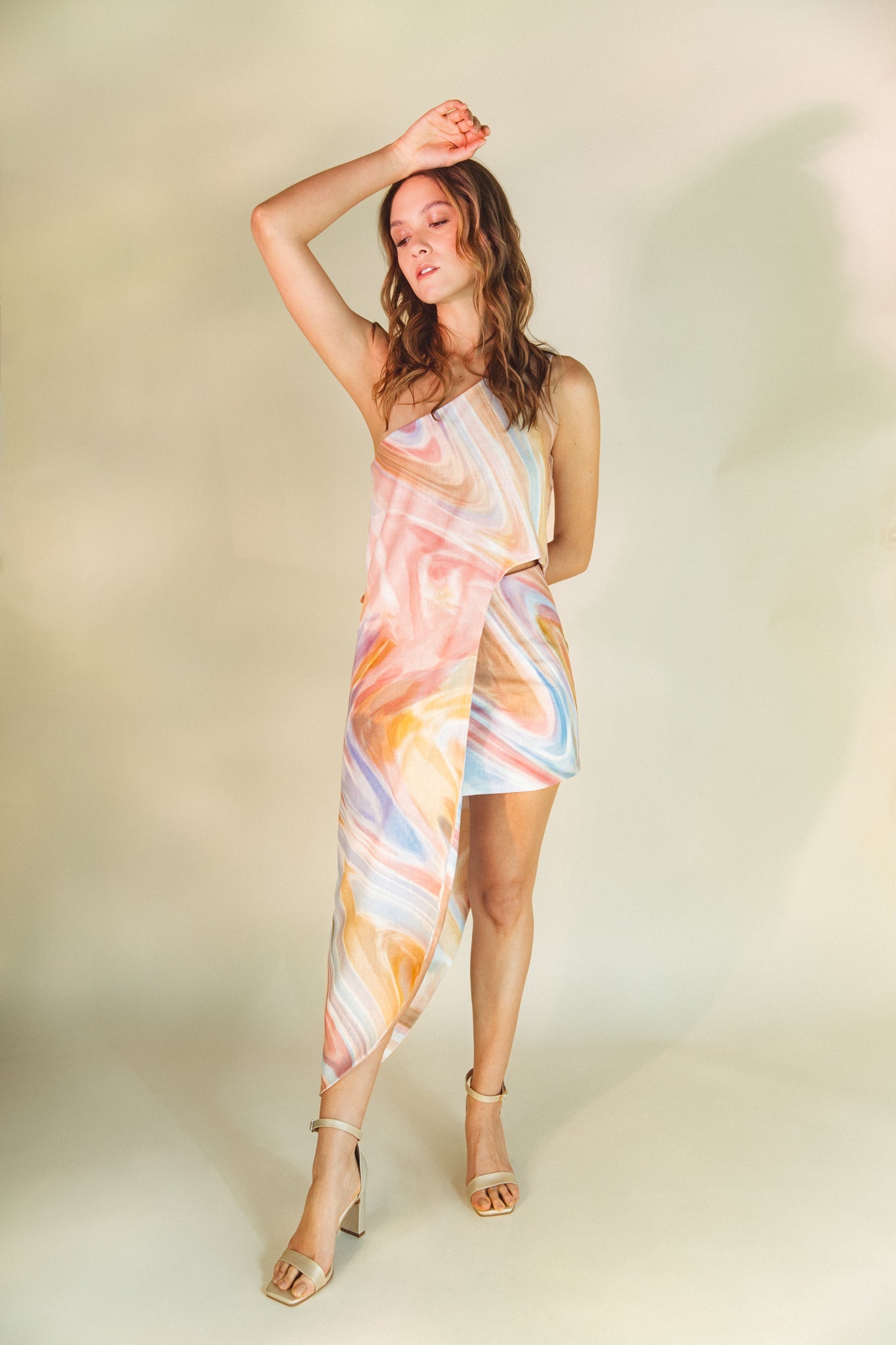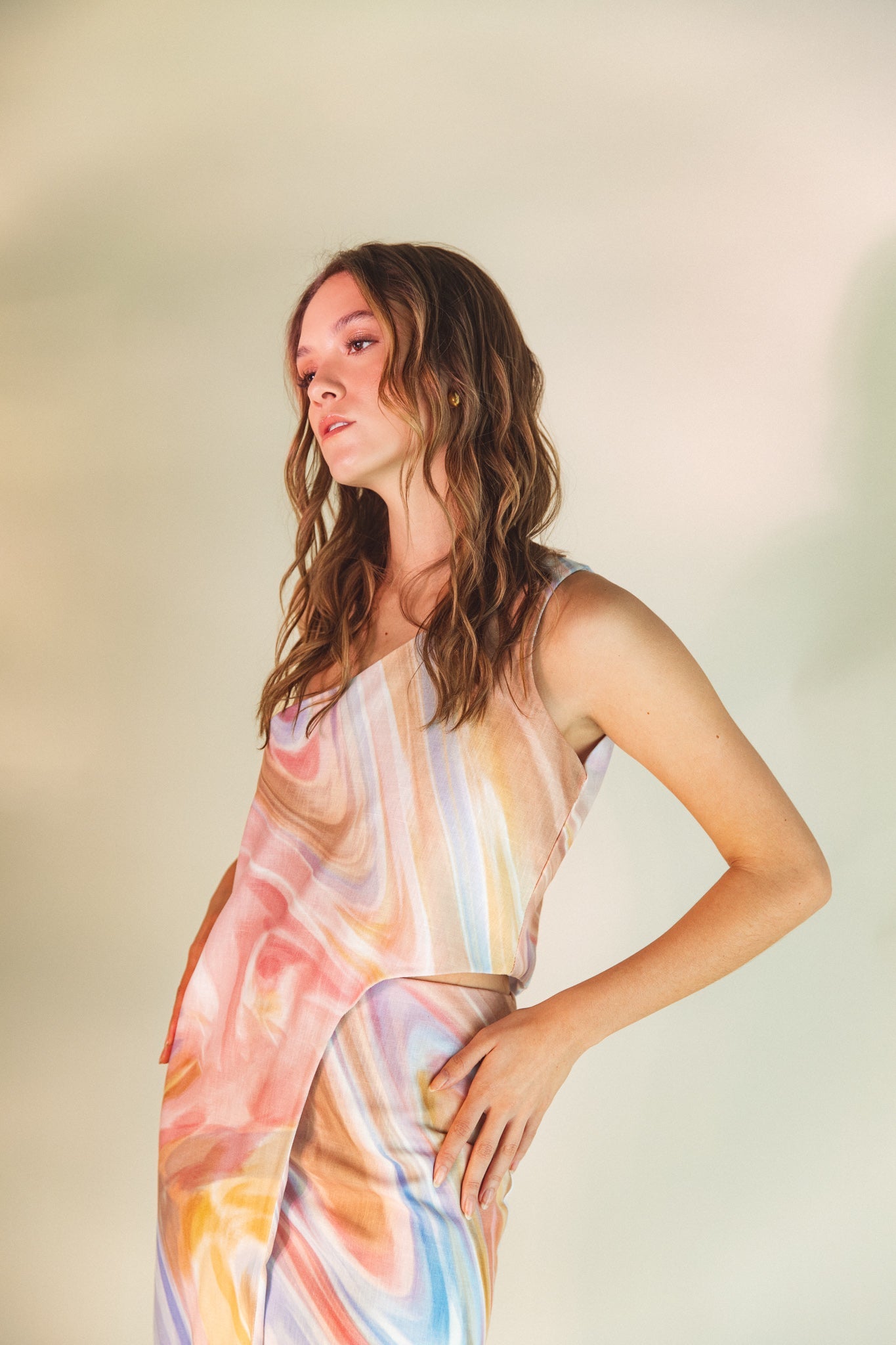 Long linen top with an asymmetrical neckline and side slit, featuring an abstract pastel print. Its fluid and modern design brings freshness and sophistication.
