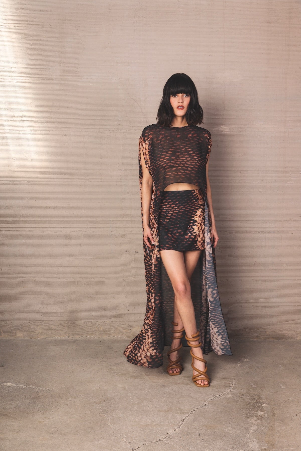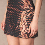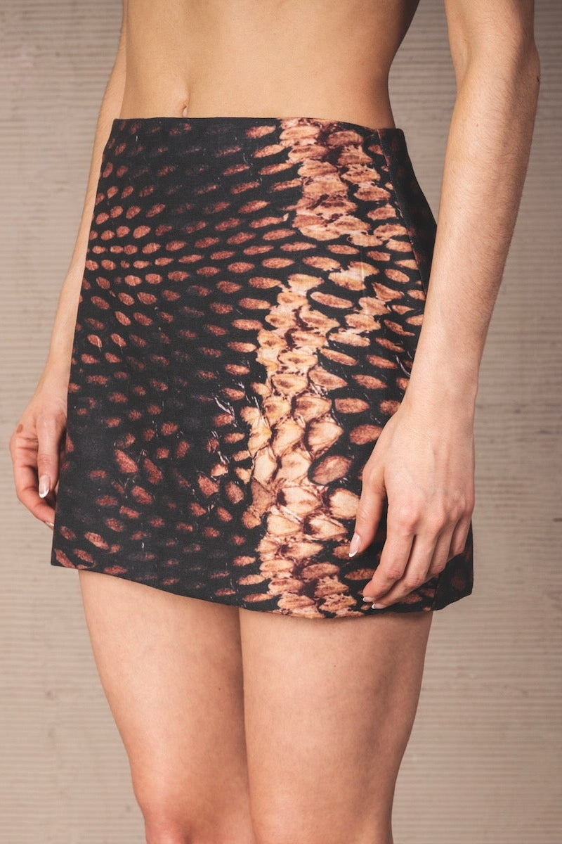 Short skirt in linen cotton with a mid-rise waist and a straight silhouette that elegantly enhances the figure. With a snake-type print in shades of black, caramel, and beige. Includes an invisible zipper at the back for greater comfort.