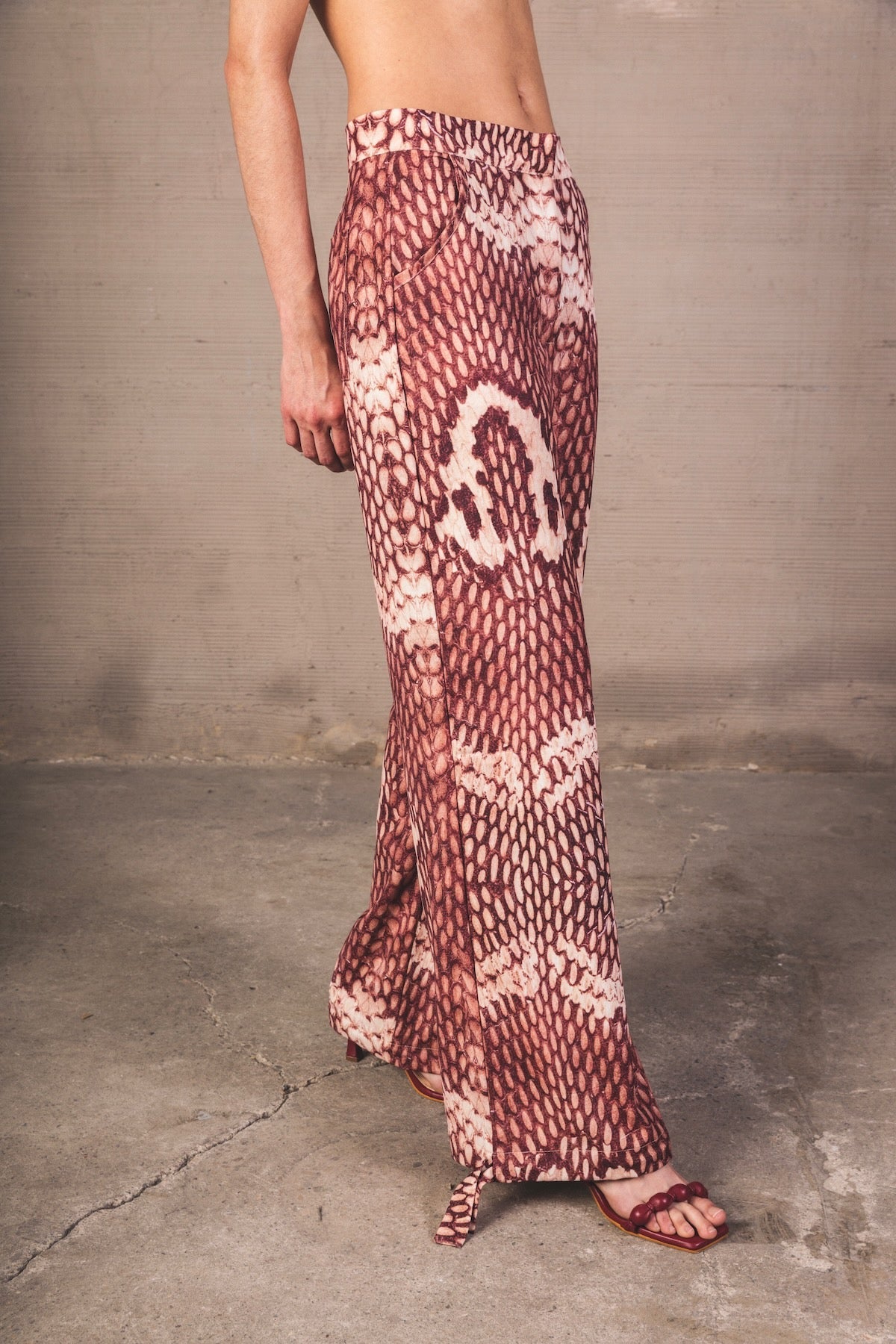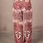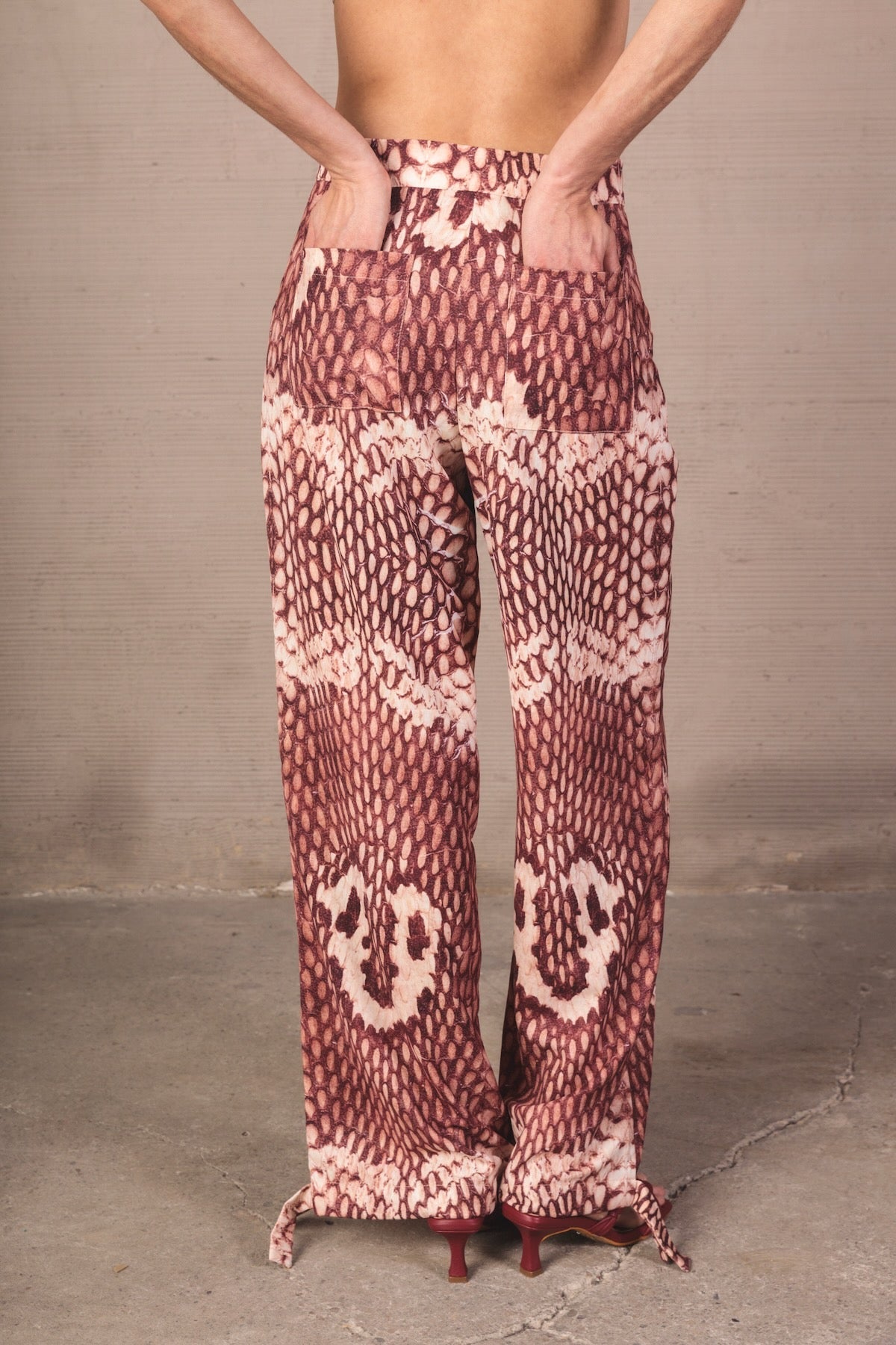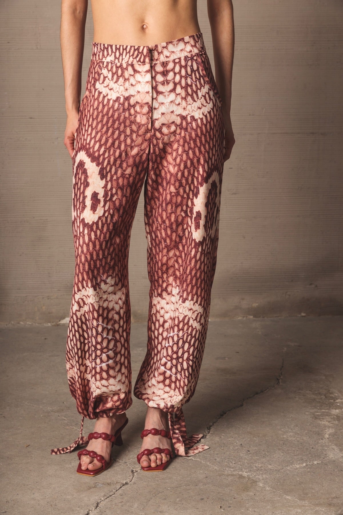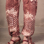 Mid-rise pants with a relaxed silhouette and fluid drape. Made from a lightweight fabric with a snake print in terracotta and cream tones. Includes functional pockets and adjustable straps at the hem for a versatile and distinctive finish.