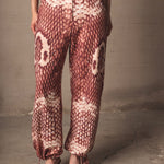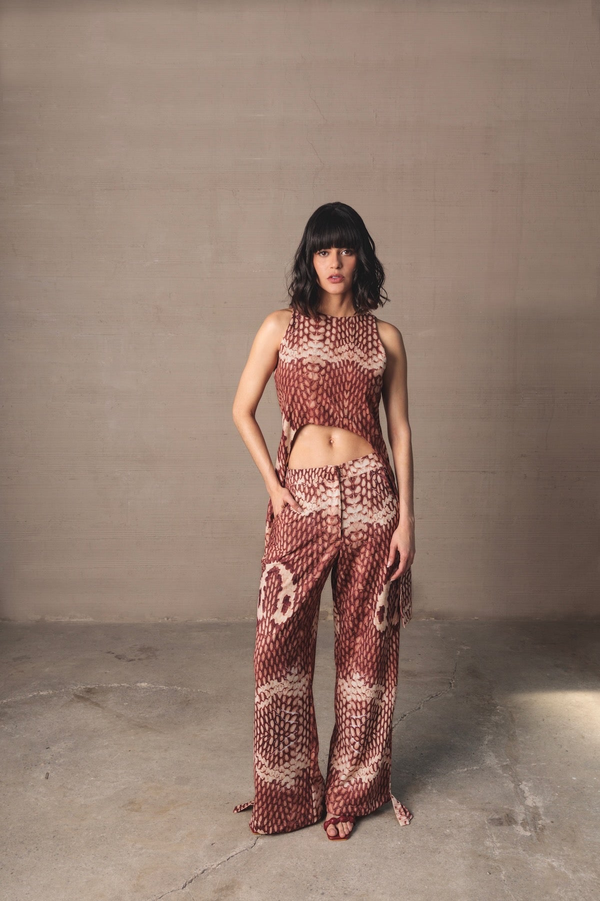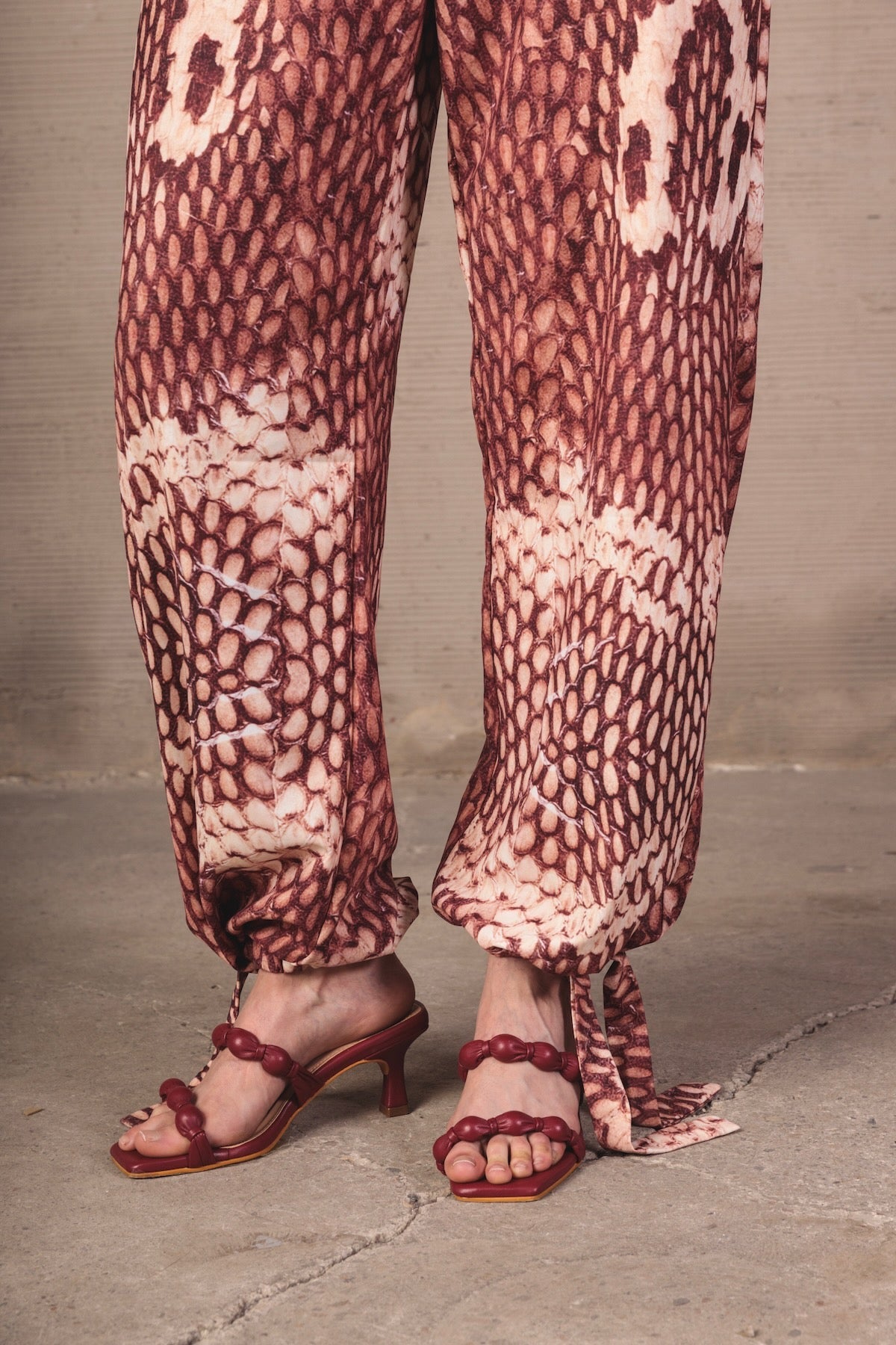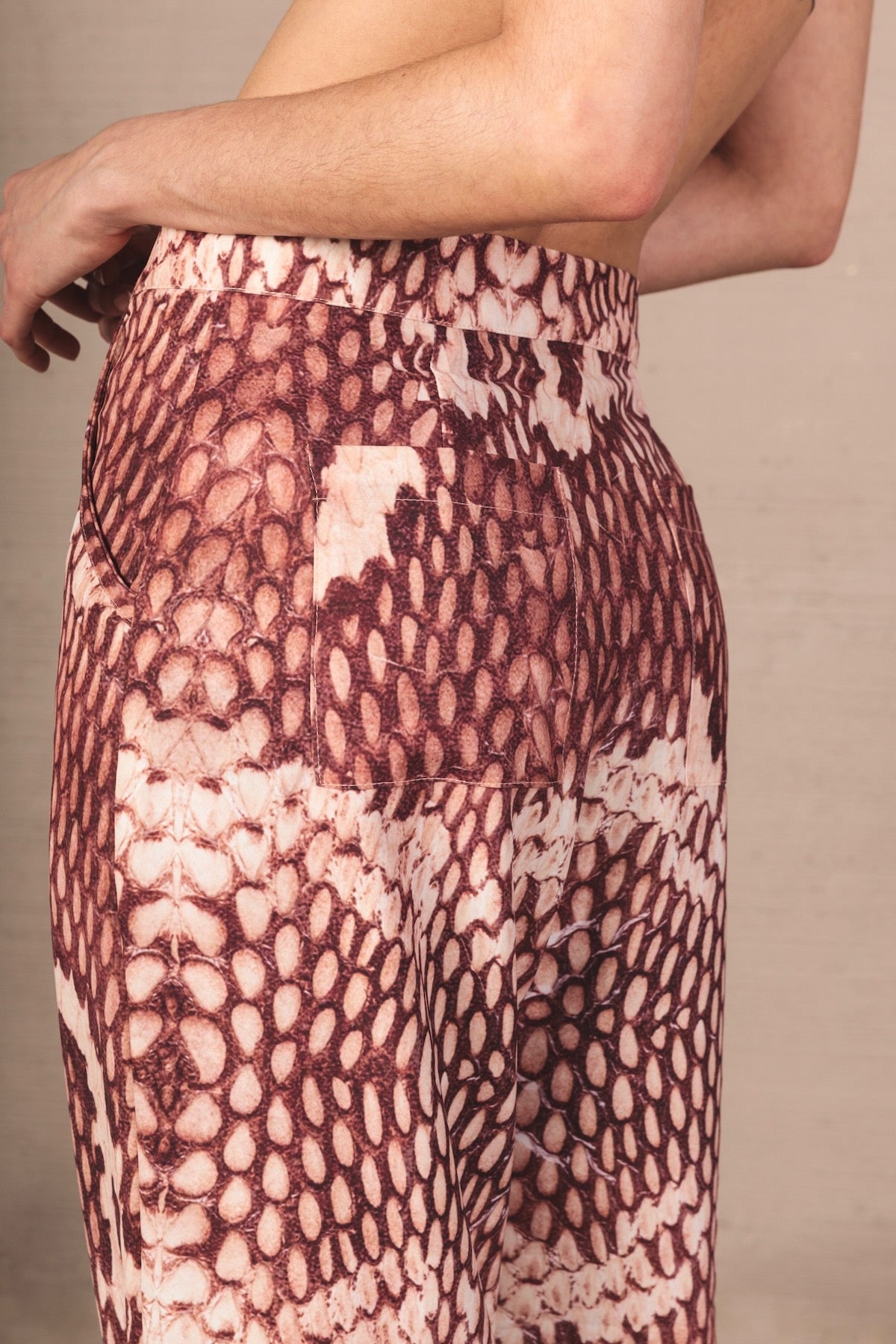 Mid-rise pants with a relaxed silhouette and fluid drape. Made from a lightweight fabric with a snake print in terracotta and cream tones. Includes functional pockets and adjustable straps at the hem for a versatile and distinctive finish.