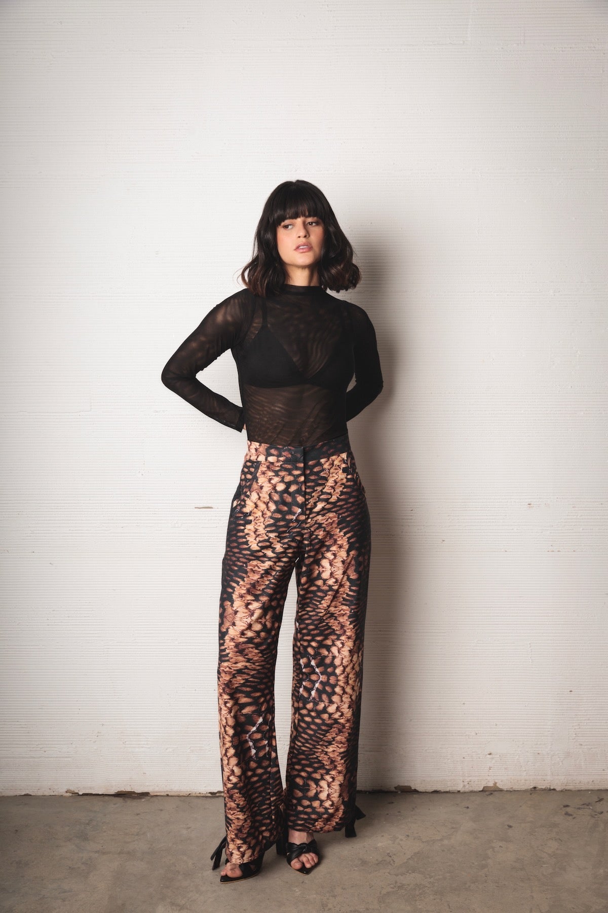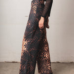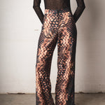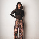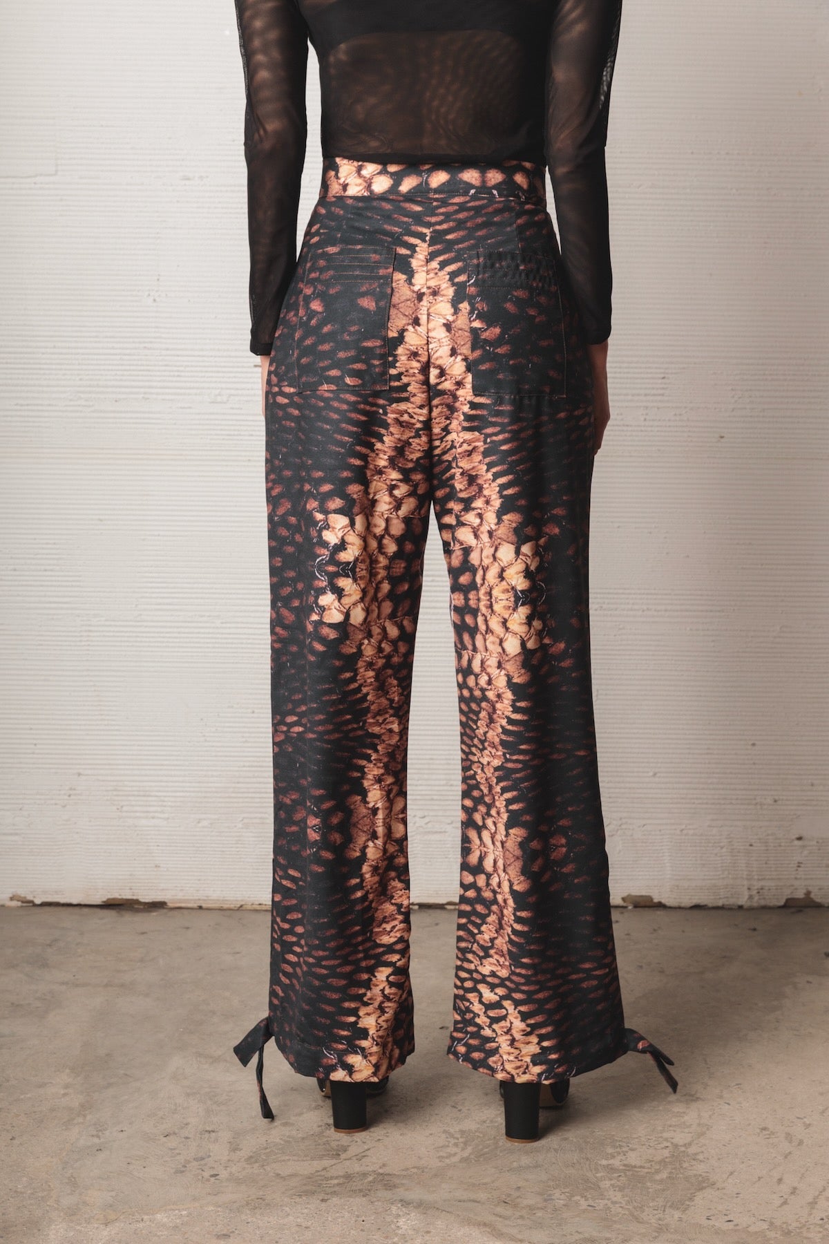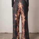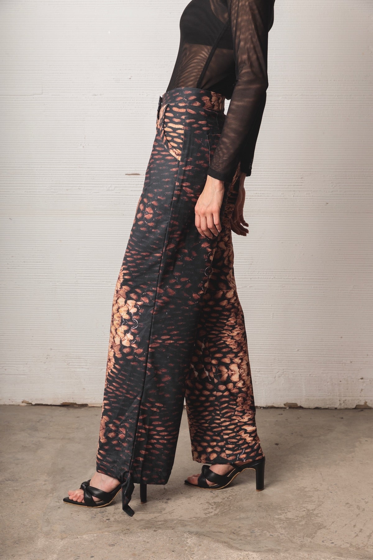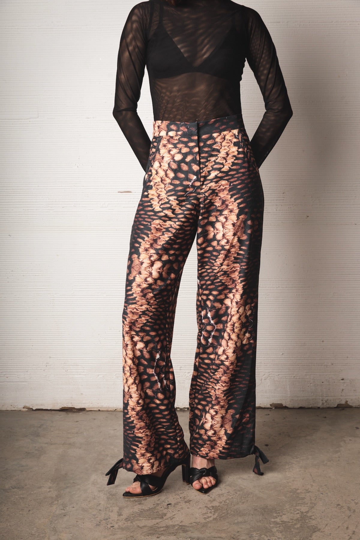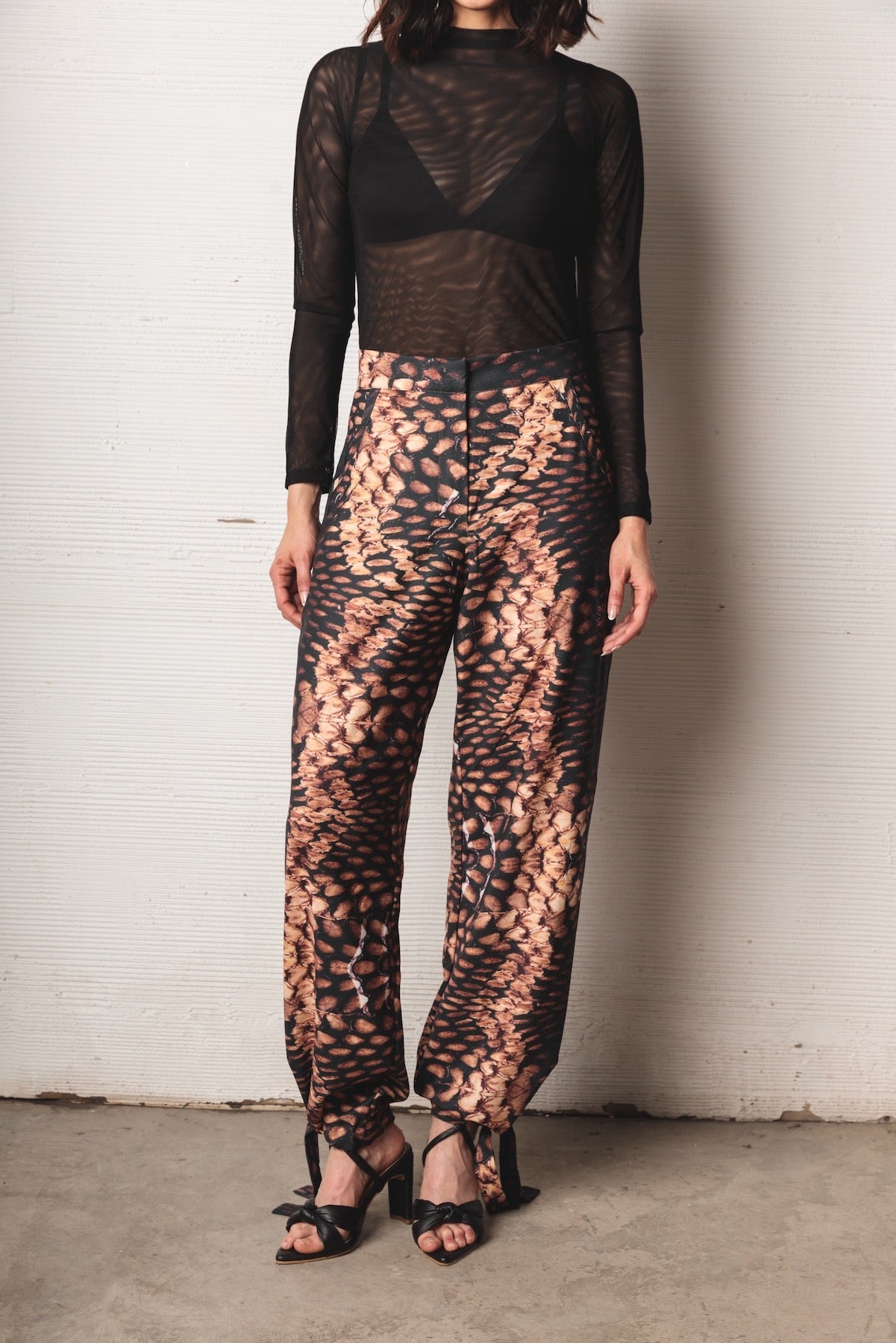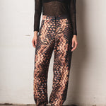Mid-rise pants with a relaxed silhouette and fluid drape. Made from a lightweight fabric with a snake-like print in black, caramel, and beige tones. Includes functional pockets and adjustable straps at the hem for a versatile and distinctive finish.