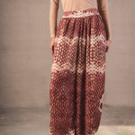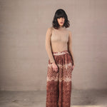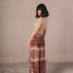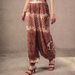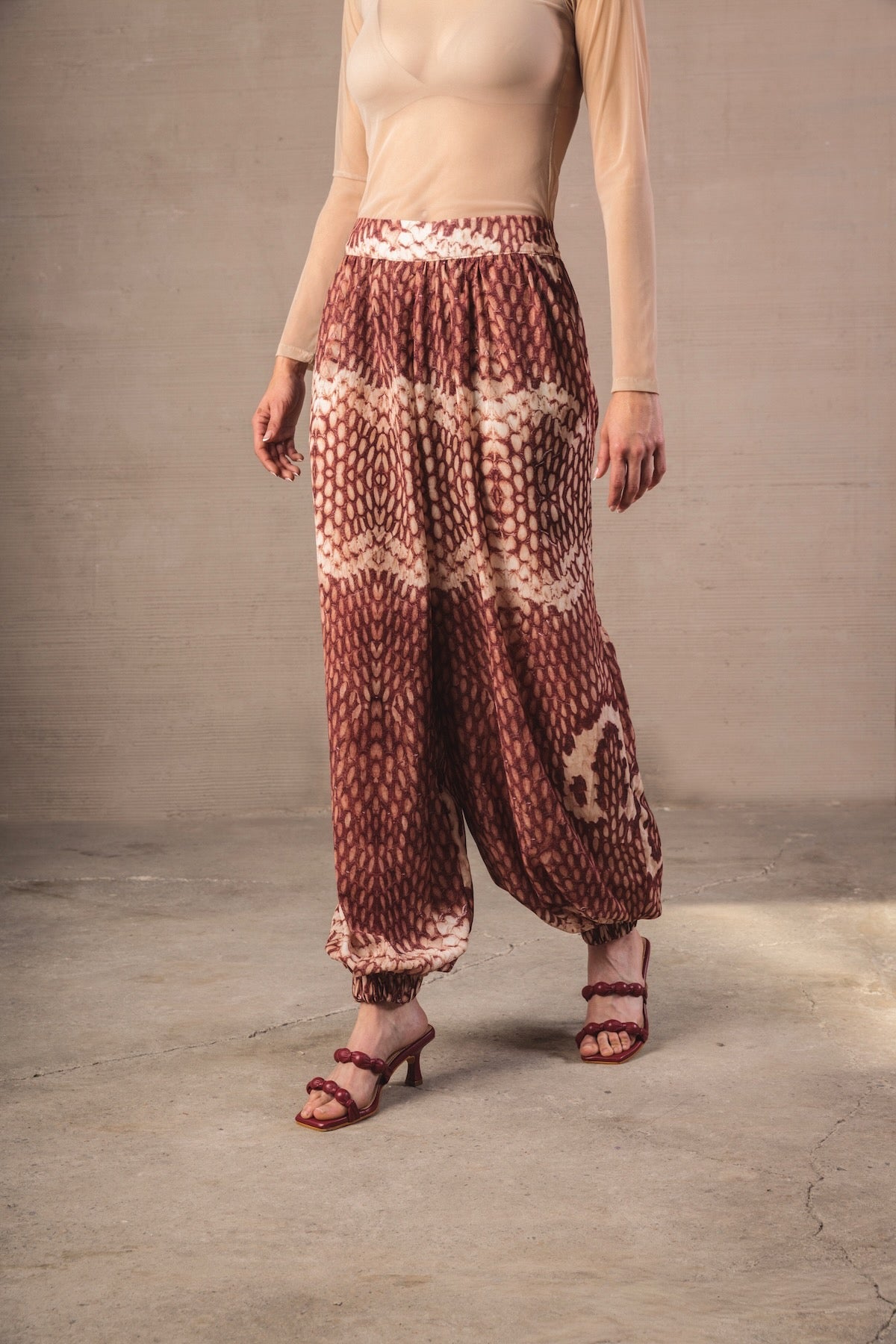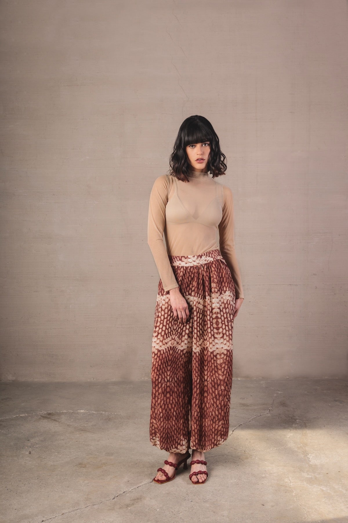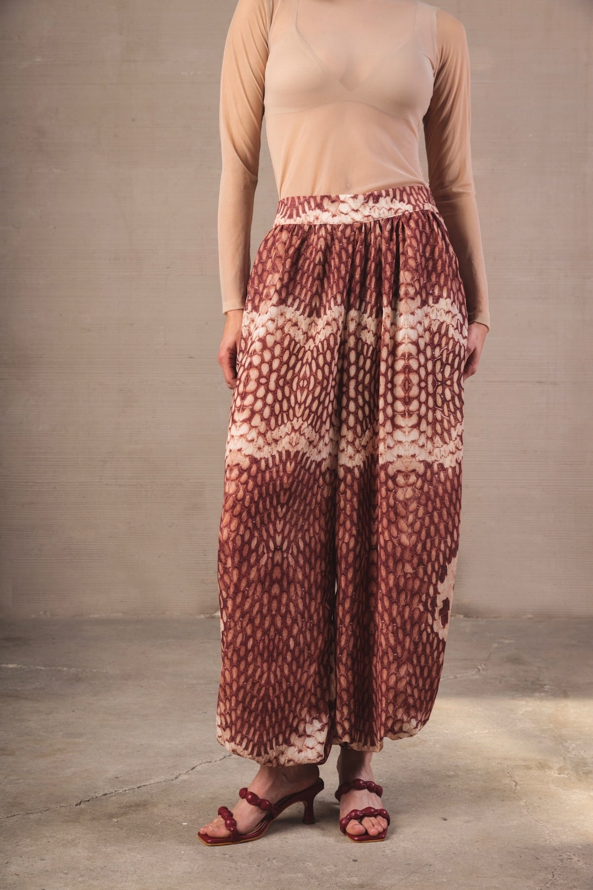 Mid-rise baggy trousers with a wide, fluid, and relaxed-inspired silhouette. Made from a light fabric that follows movement, it features a snake-type print in terracotta and cream tones, creating a striking and harmonious visual effect. The design includes a flat waistband that slims the waist, along with a soft volume in the legs that gathers at the ankle thanks to a delicate elastic, providing structure without sacrificing comfort.
