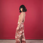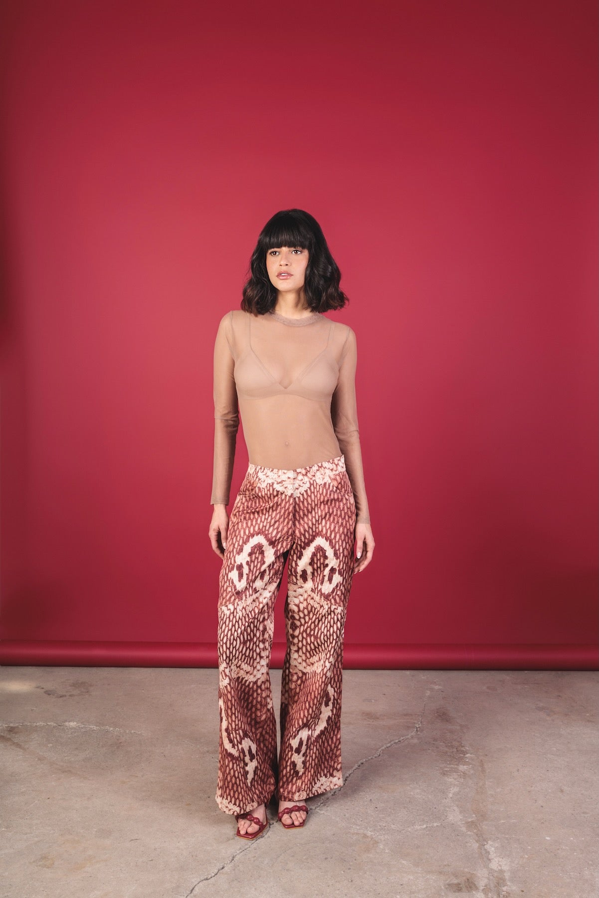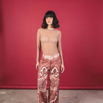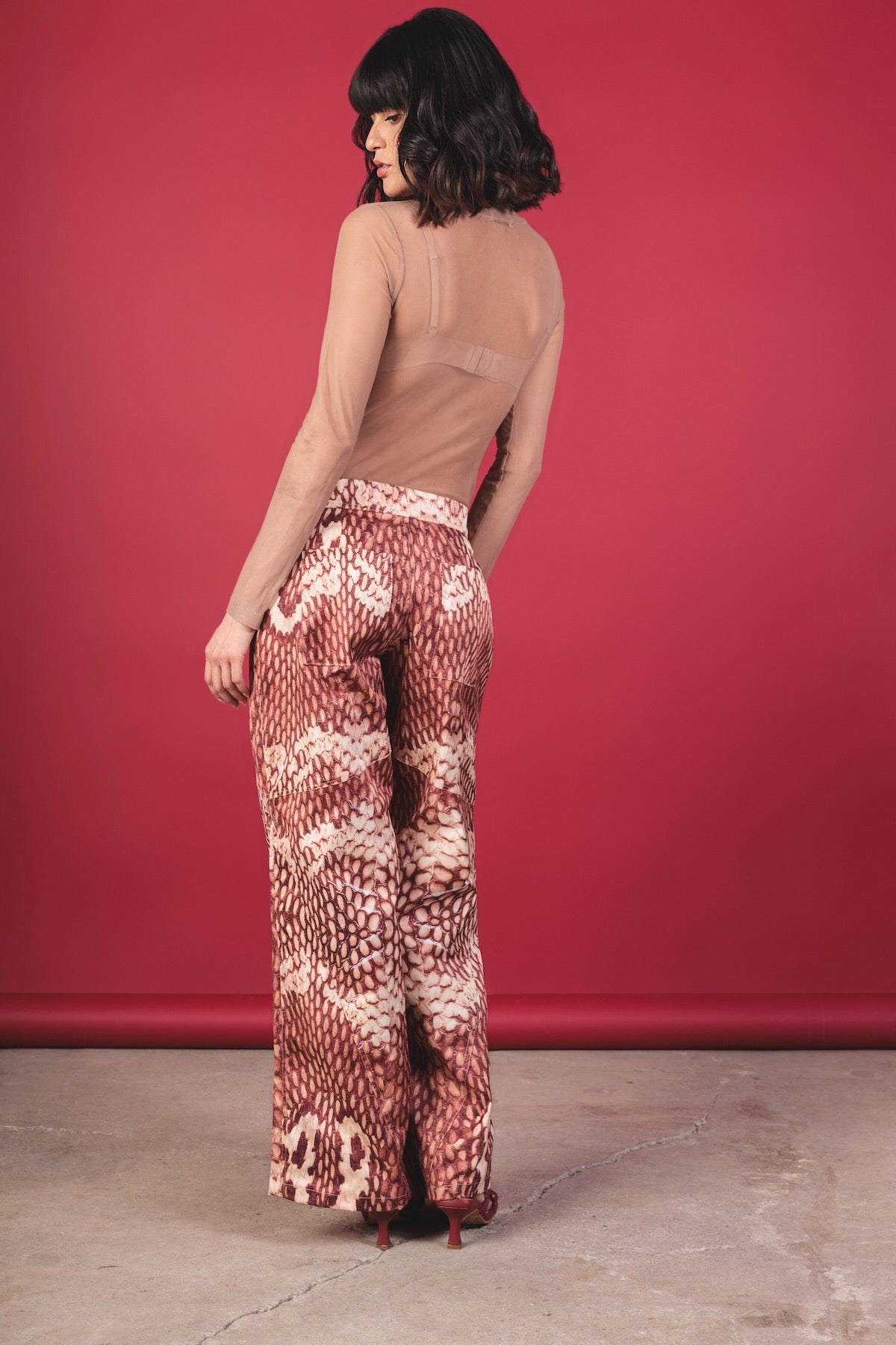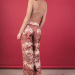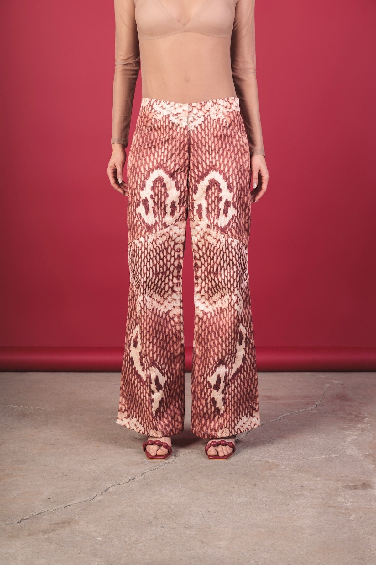 Printed mid-rise trousers with a relaxed and fluid silhouette. They stand out for their snake-type print in terracotta, cream, and wine tones, which creates a unique and elegant visual effect. The design features a straight and wide cut with a natural drape, providing movement and a sense of comfort. It includes discreet pockets that add functionality without interrupting the design.
