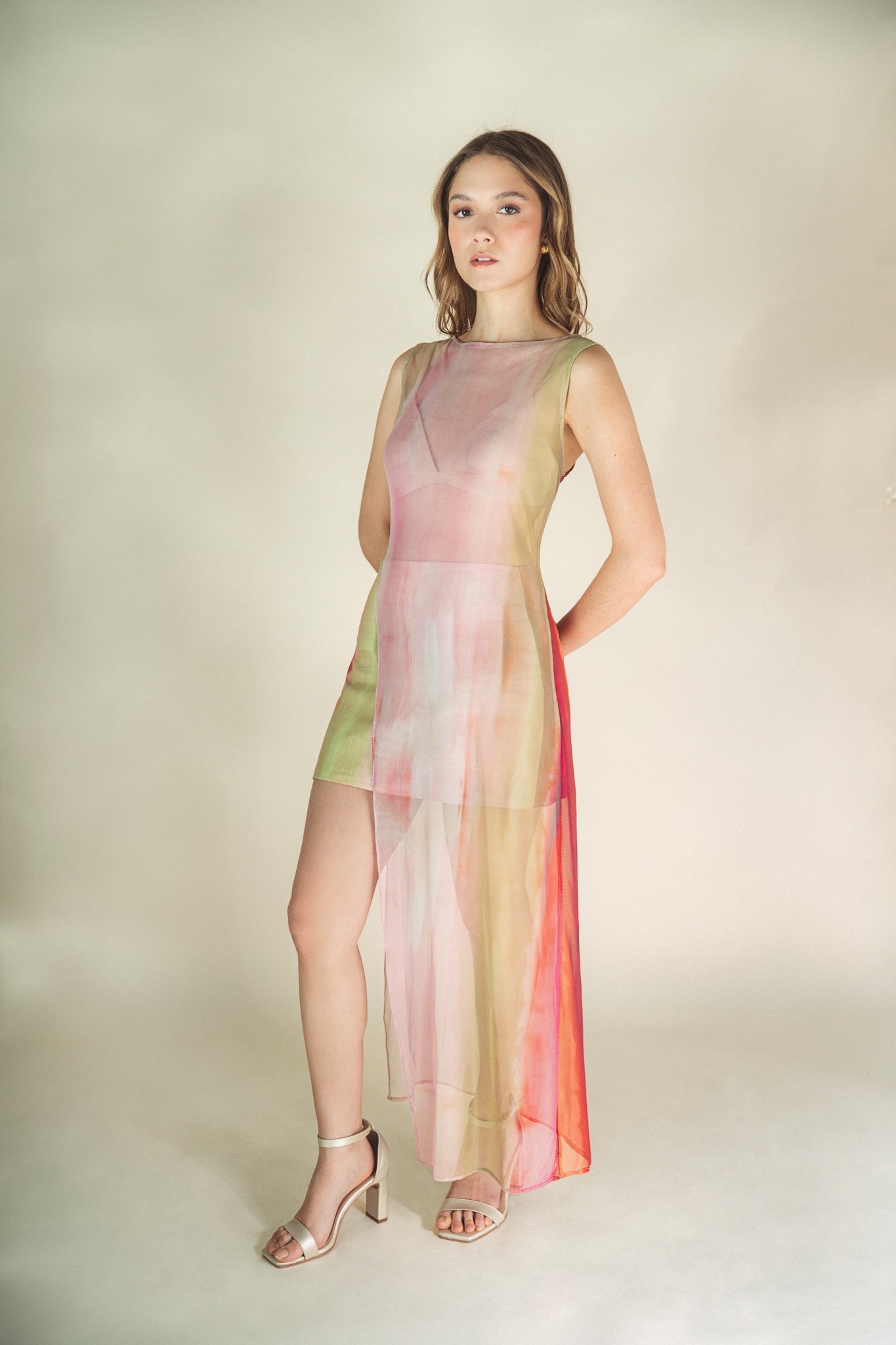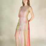 Long sleeveless mesh top with a round neckline. Its fluid and elegant design, combined with a vibrant, soft-toned print, makes it perfect for warm days.