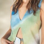 Sleeveless lightweight top with a deep V-neck and front slit, offering a modern and sophisticated touch with a blue and green gradient print.