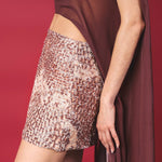 Mid-rise mini skirt made of a delicate sequin-covered mesh, with a snake-like print in terracotta and cream tones. Fitted, bright, and modern; perfect for elevating any look. The print may vary, making each garment unique.