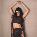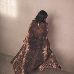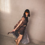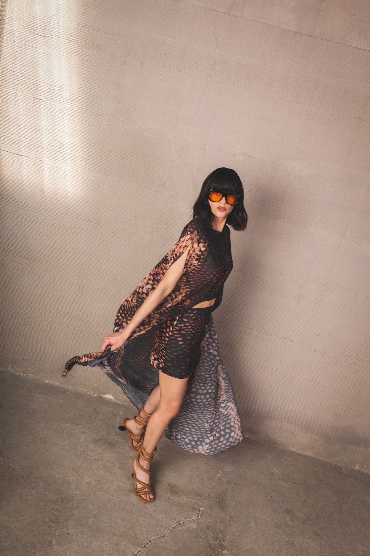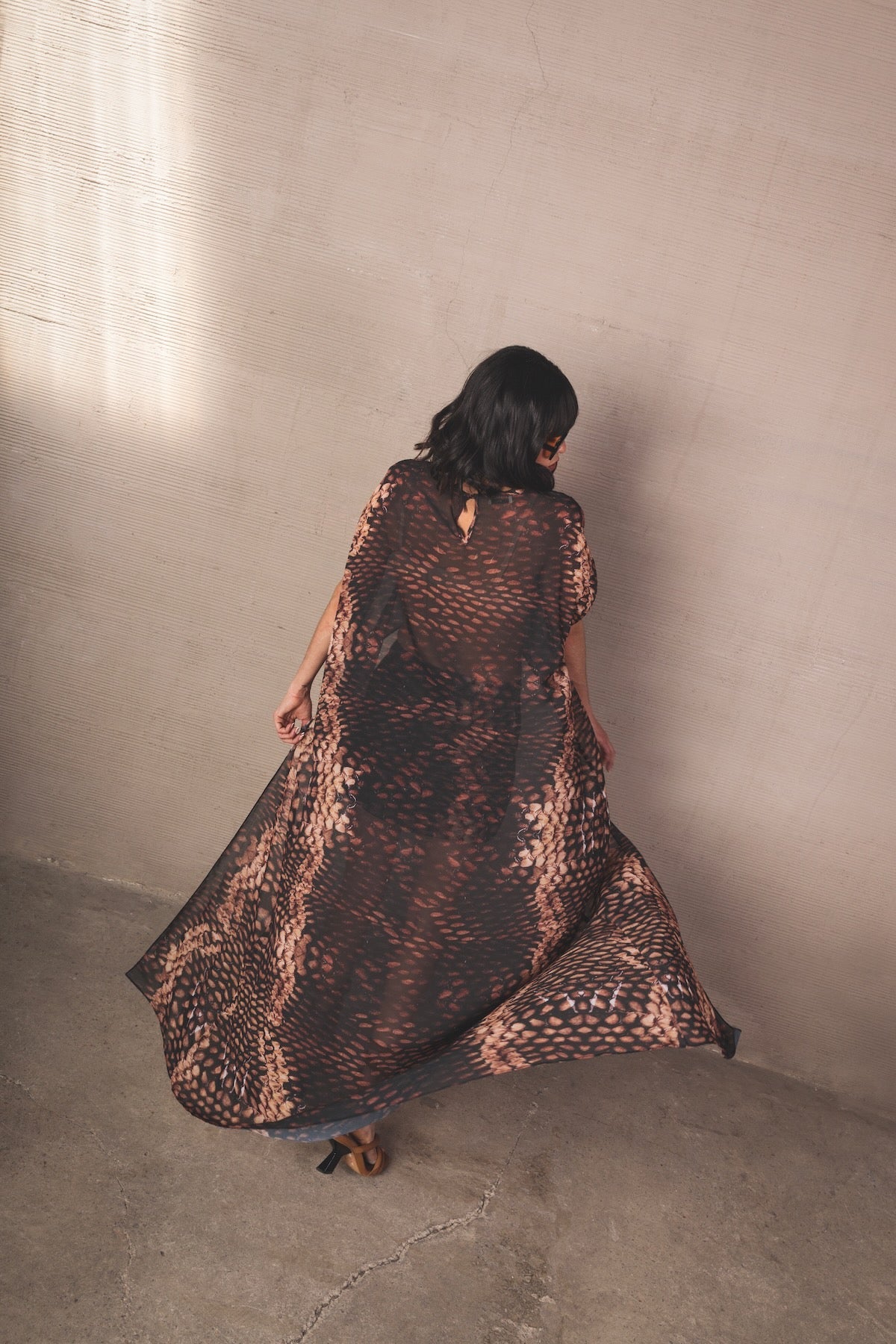 Cape-style top in snake print chiffon in black, caramel, and beige tones, with a square front cut and long back reaching the floor. Fluid, modern, and perfect for layering.