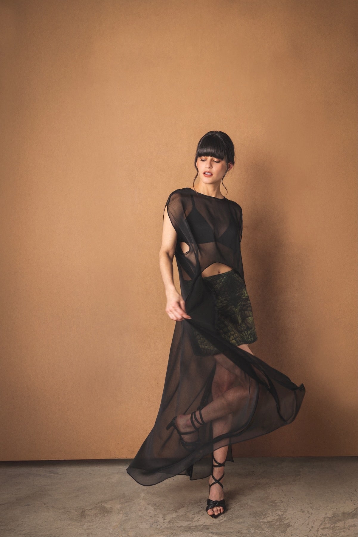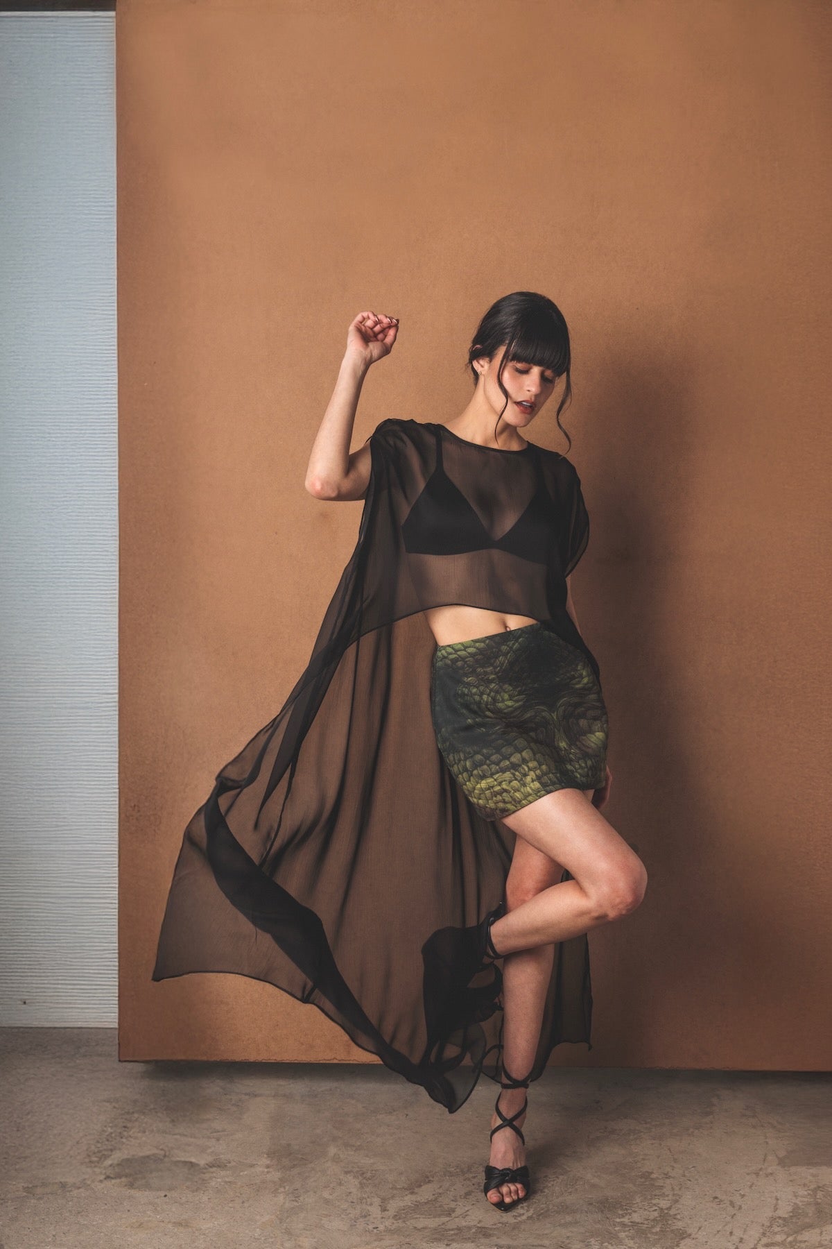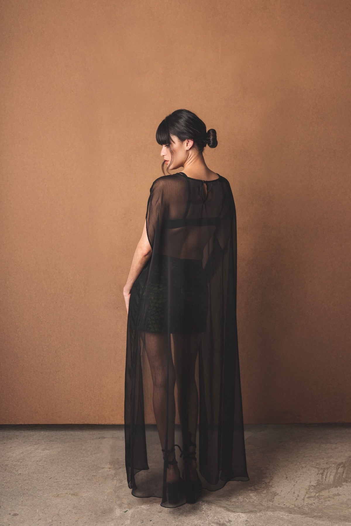 Cape style top in black chiffon with a square front cut and long back to the floor. Flowing, modern and perfect for layering.