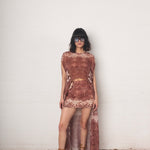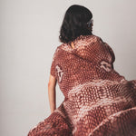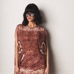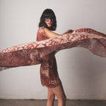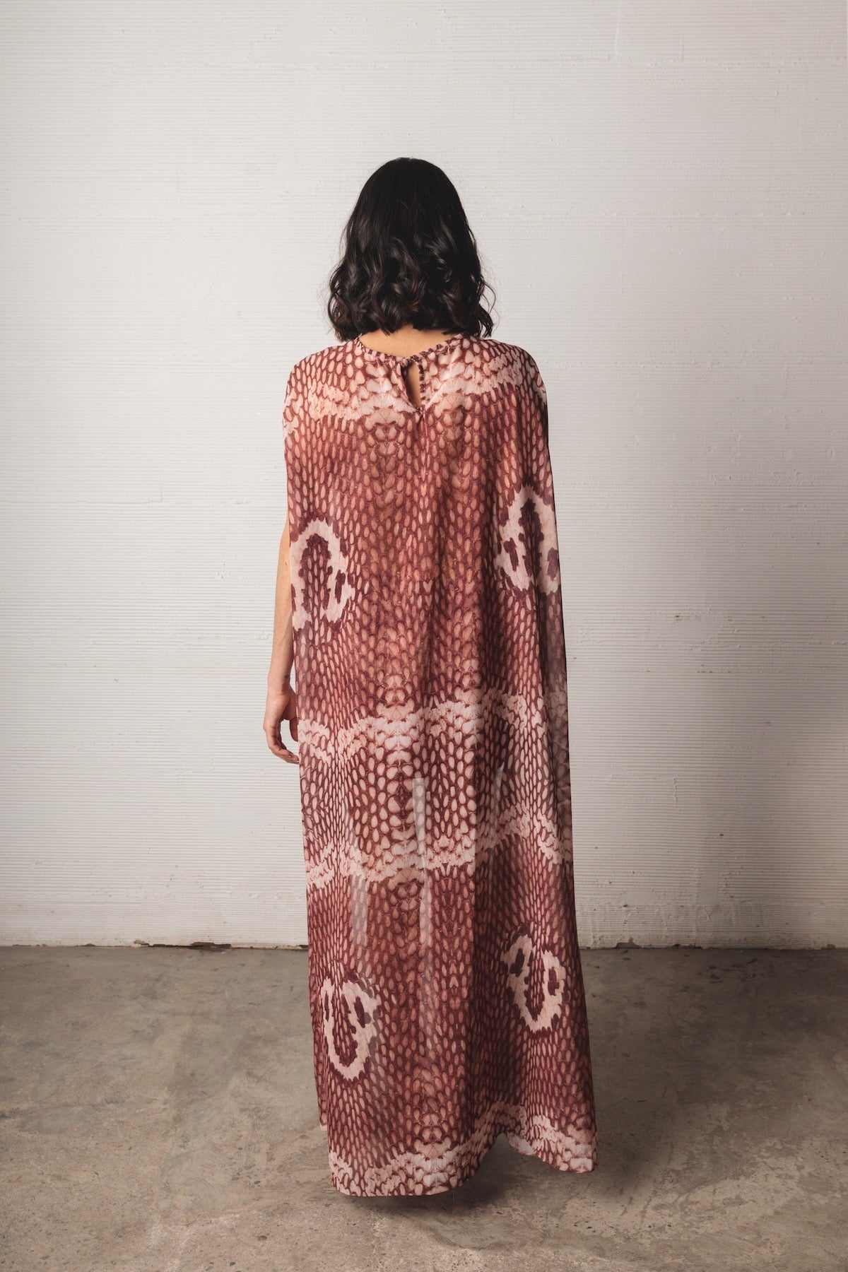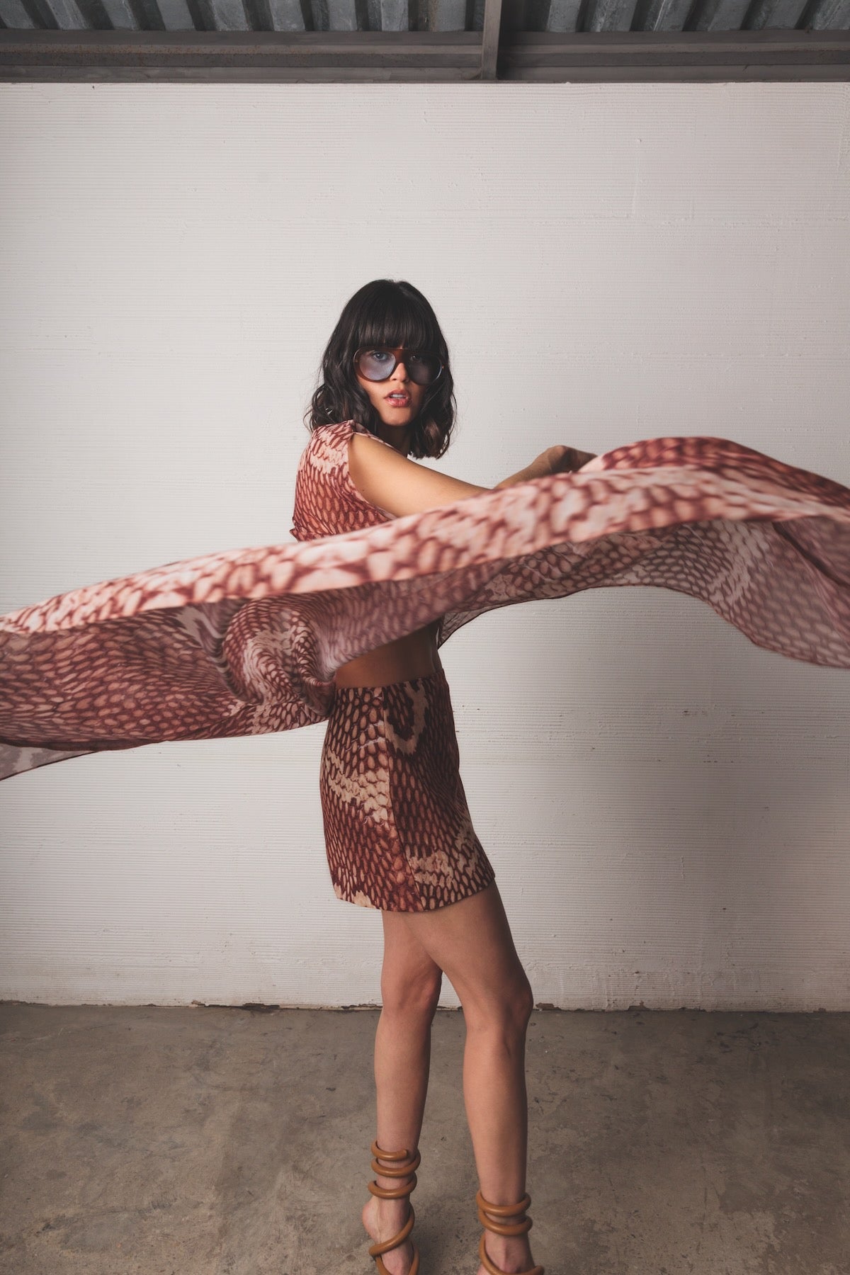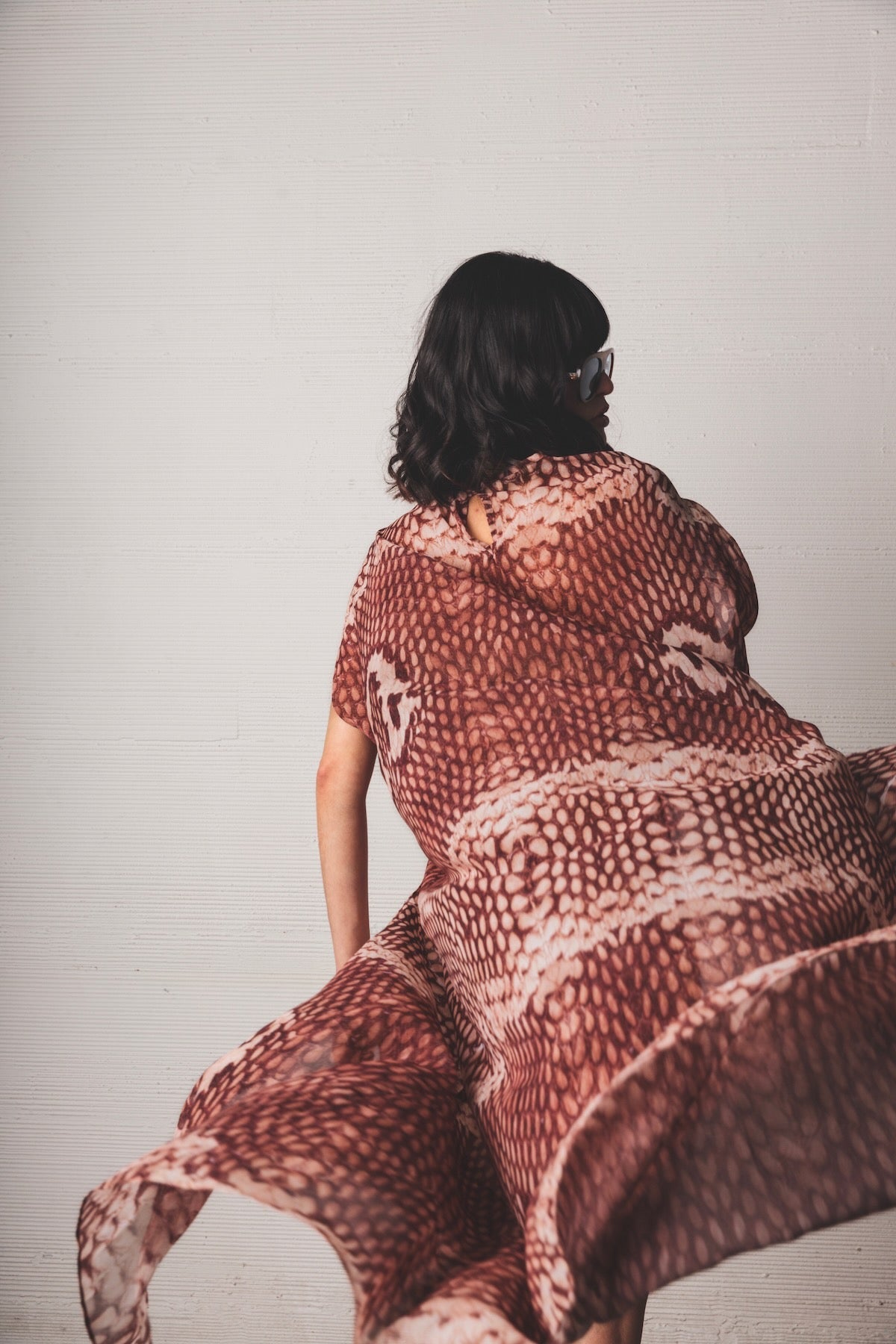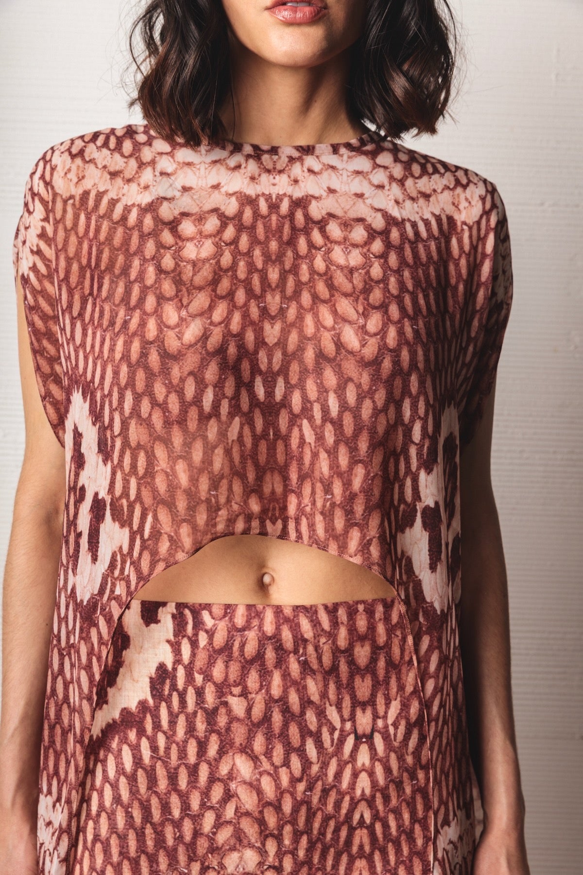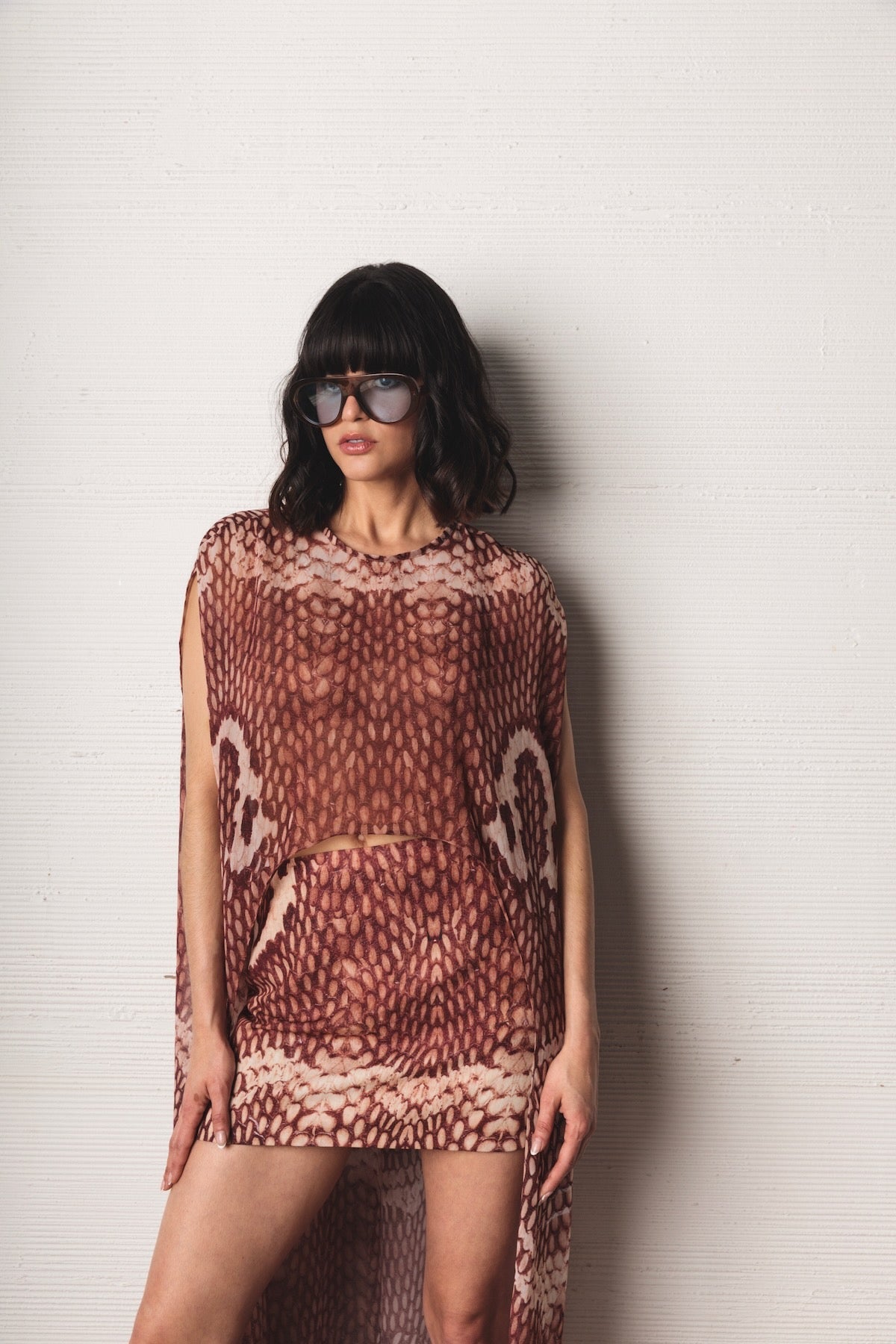 Cape-style top in snake print chiffon in terracotta and cream tones. with a square front cut and a long back reaching the floor. Fluid, modern, and perfect for layering.