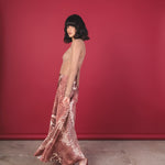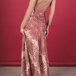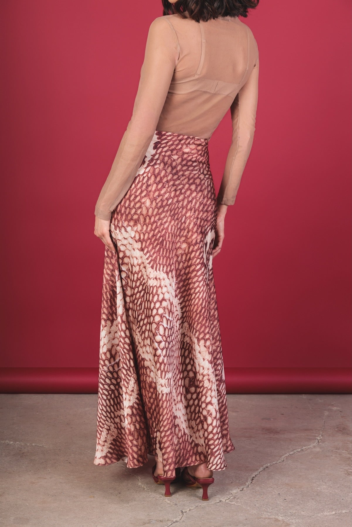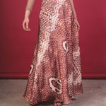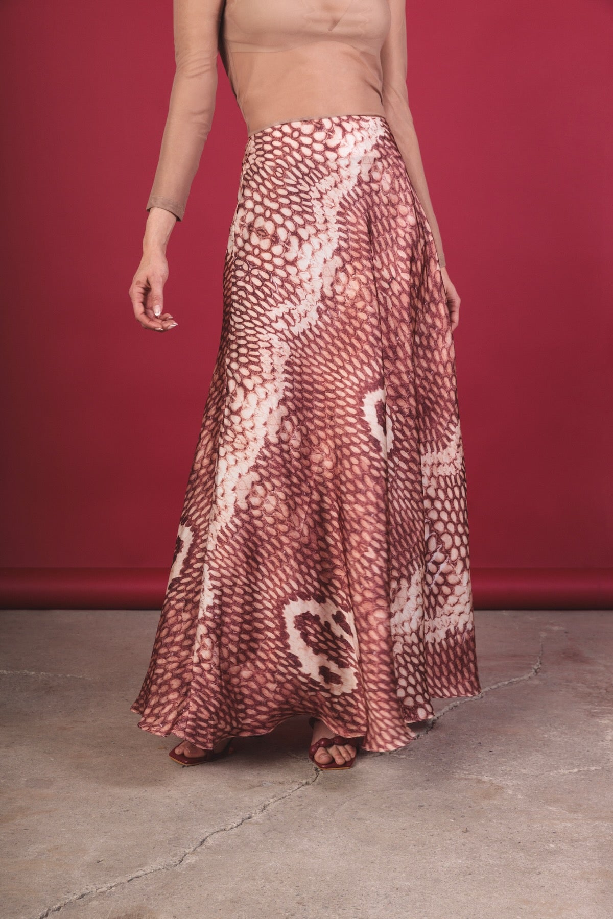Long, mid-rise skirt made of silk with a snake-like print in black, caramel, and beige tones. Its wide and fluid silhouette provides elegance and movement. It has an invisible side zipper for a clean and sophisticated finish.