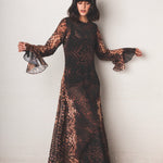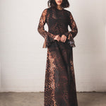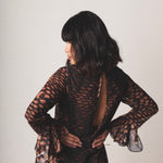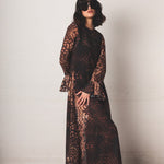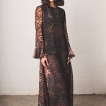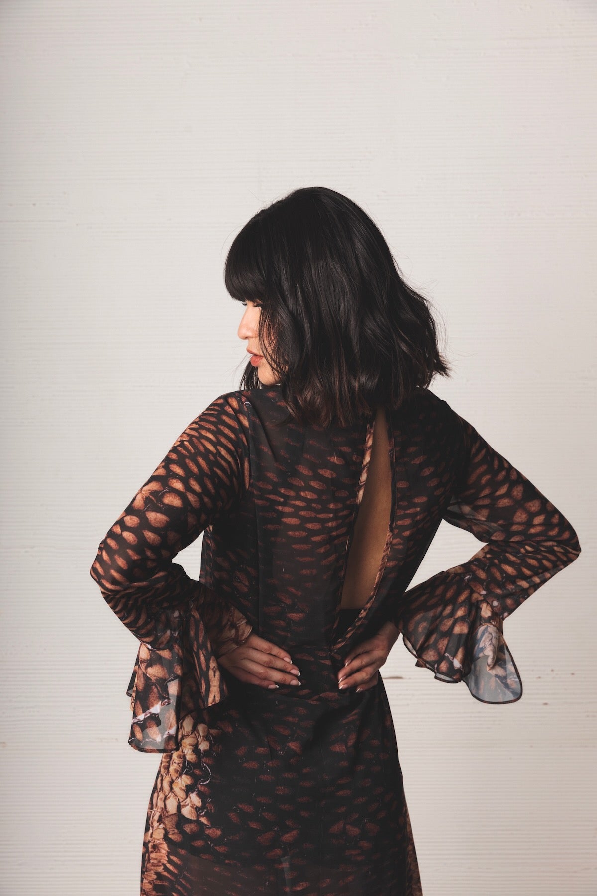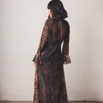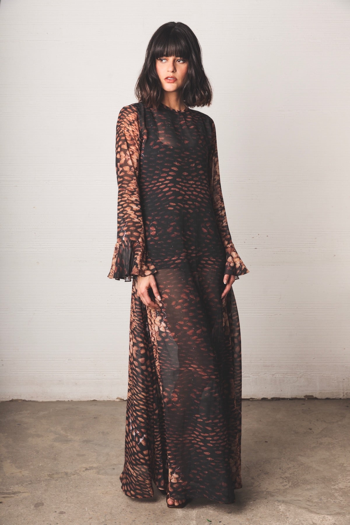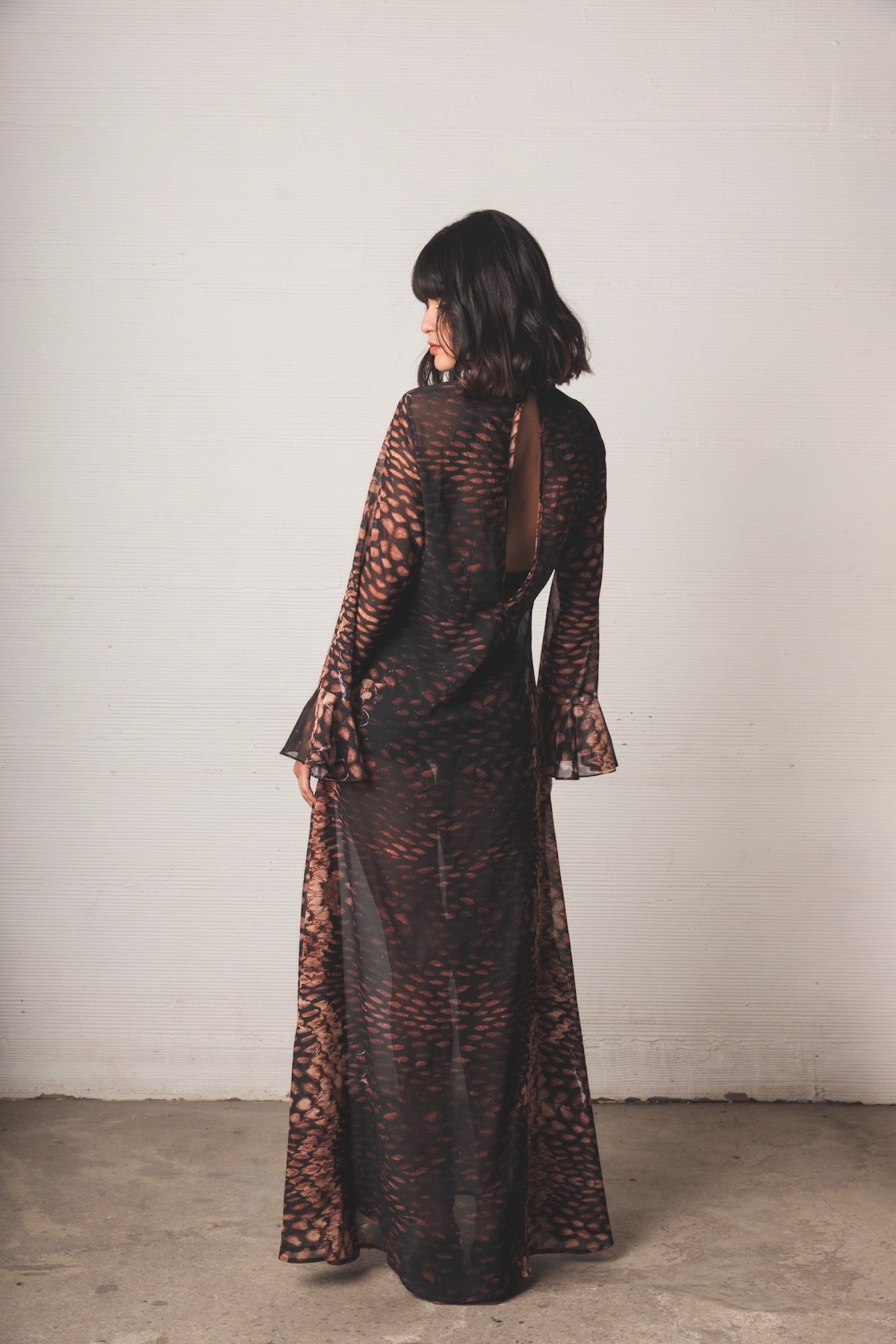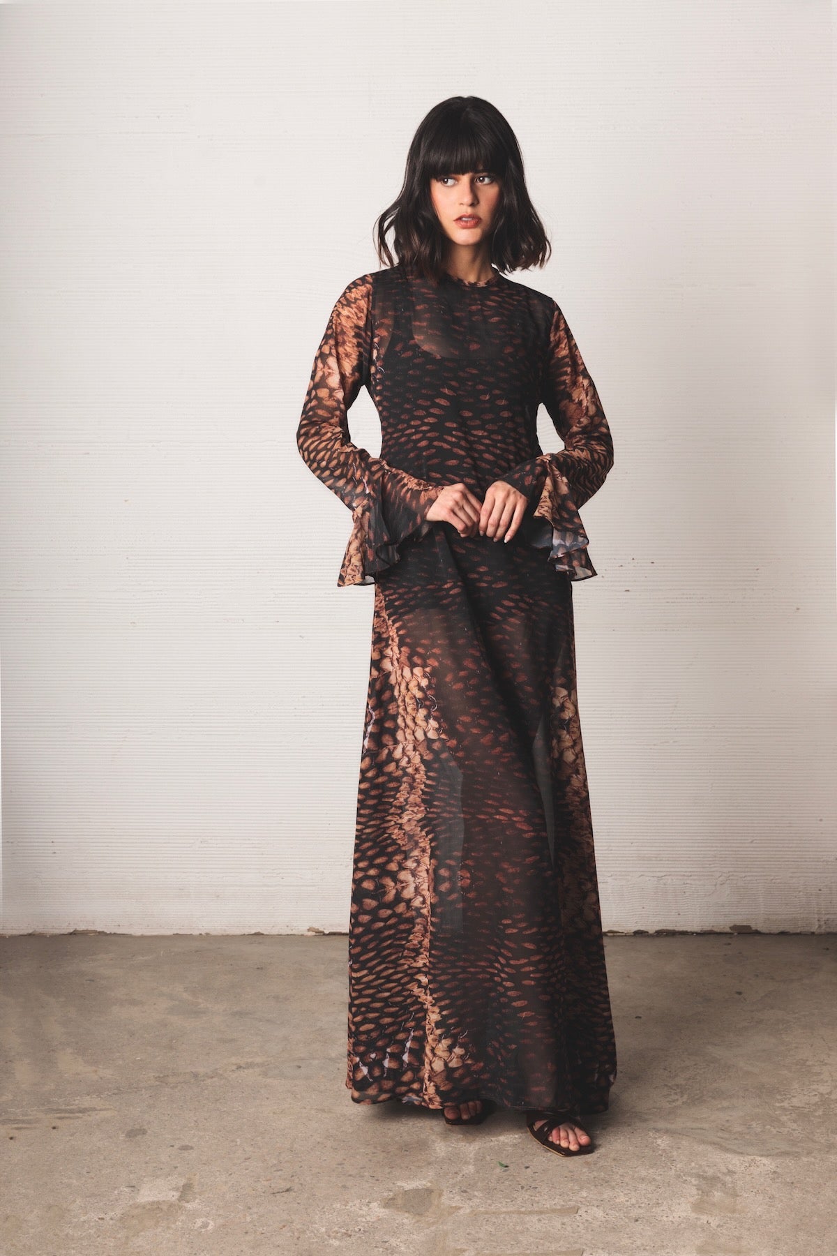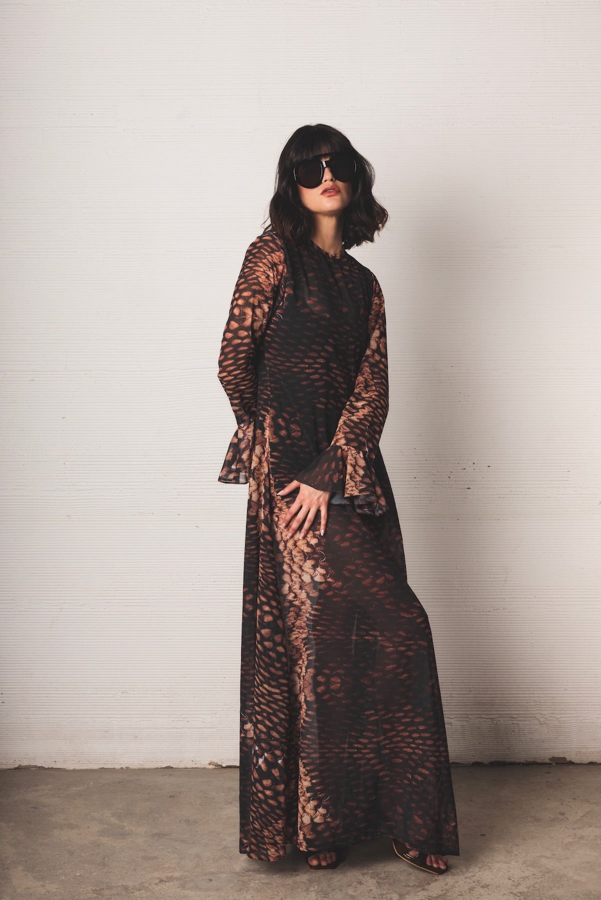Long dress in lightweight chiffon with a snake-like print in shades of black, caramel, and beige. Fluid silhouette, ruffled sleeves, and subtle back neckline. Elegant, dynamic, and versatile.