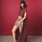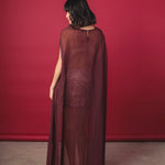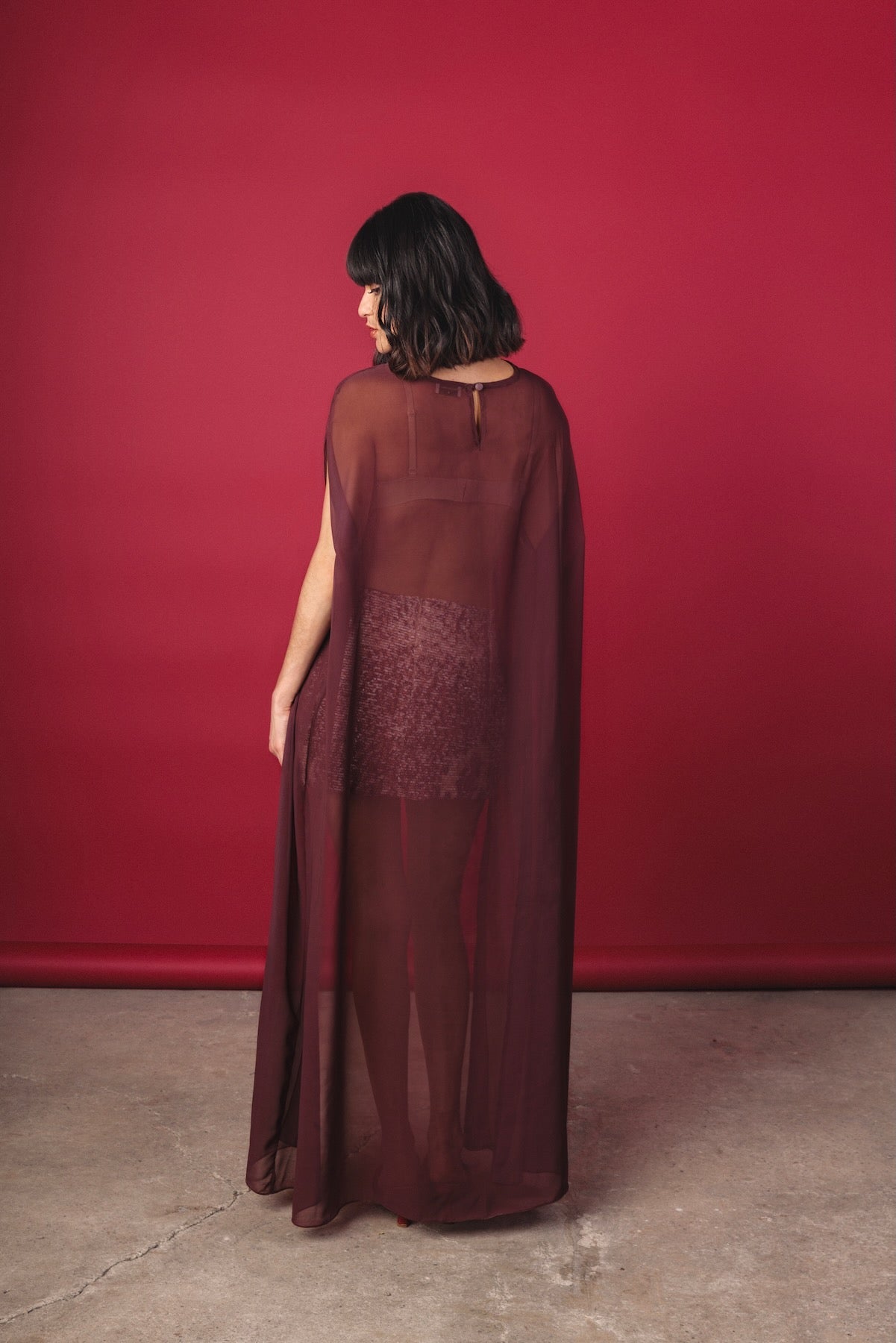 Cape-style top in burgundy chiffon with a square front cut and long floor-length back. Flowing, modern, and perfect for layering.