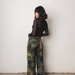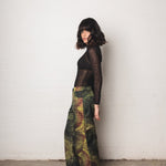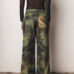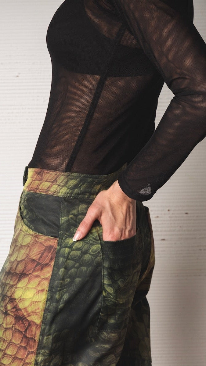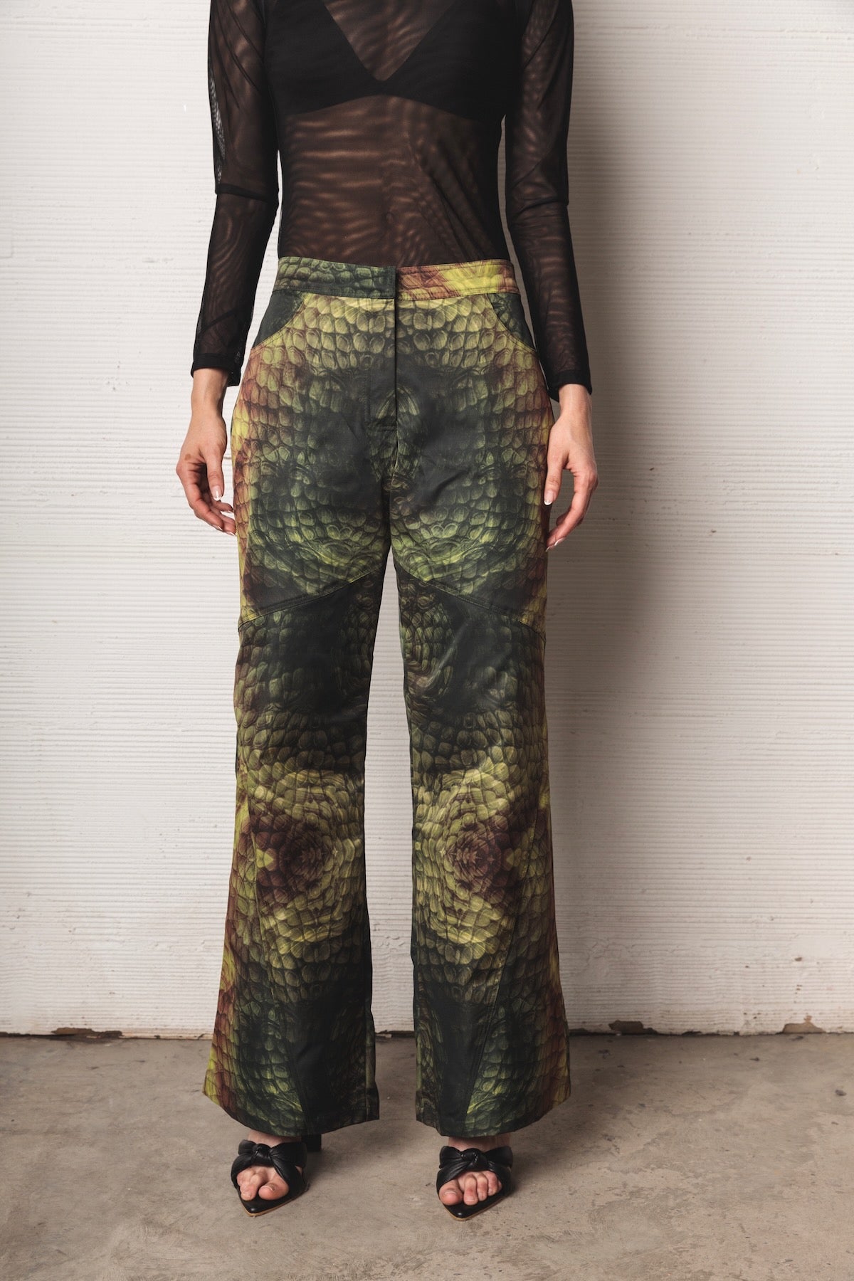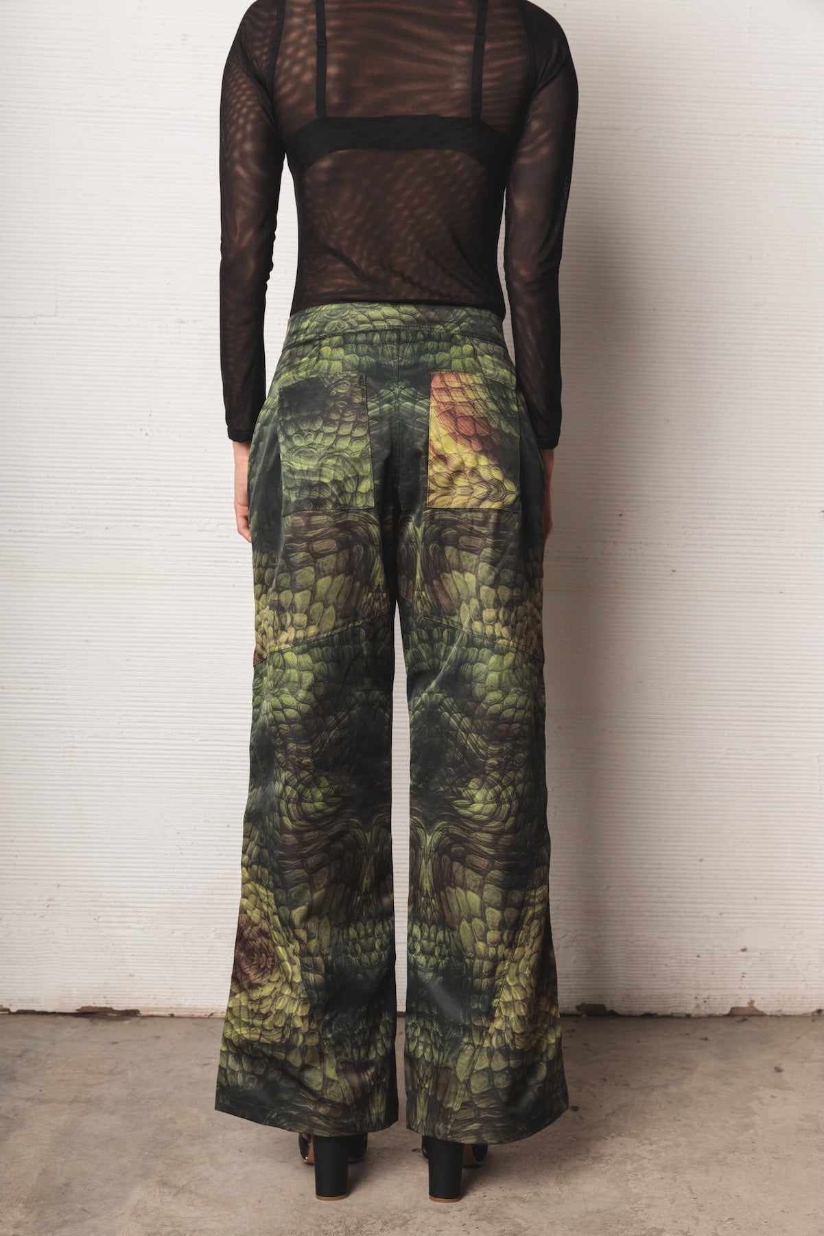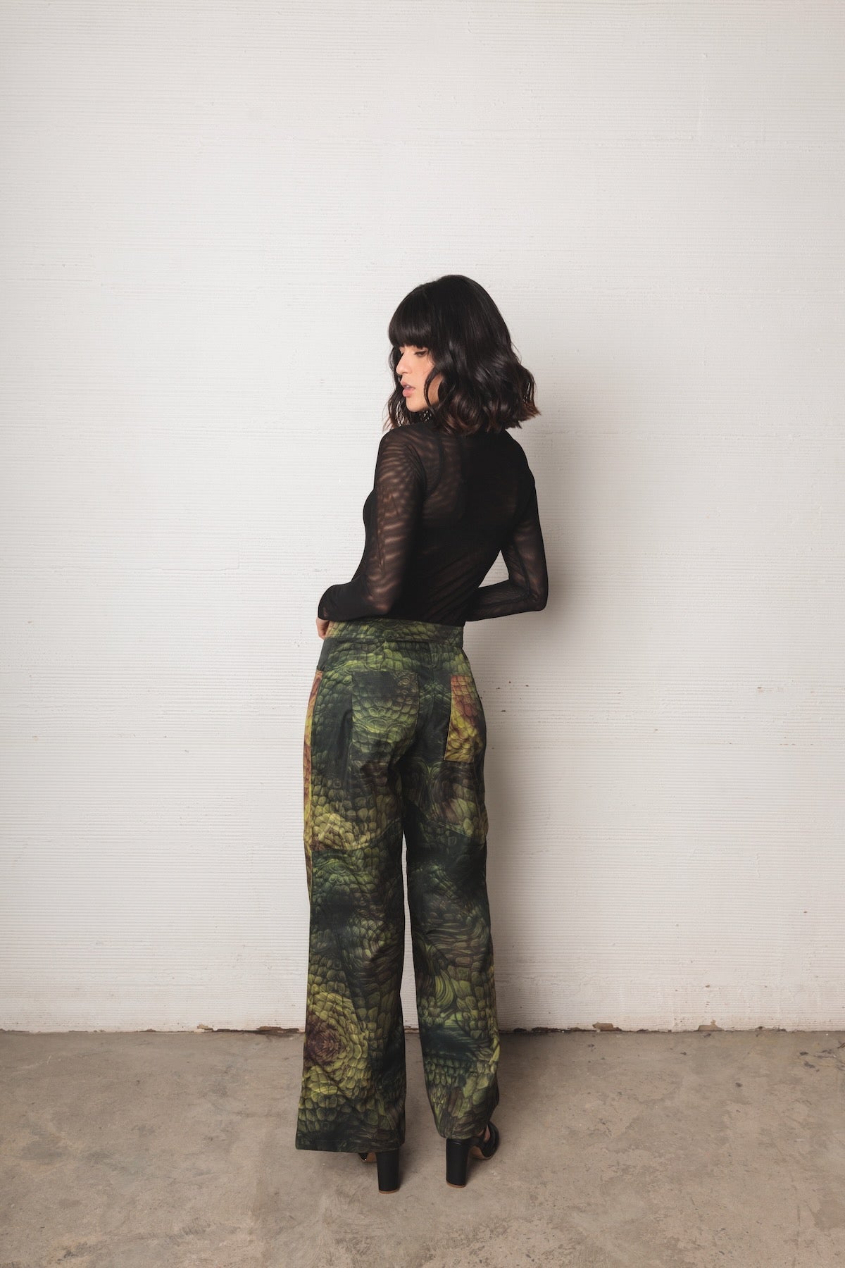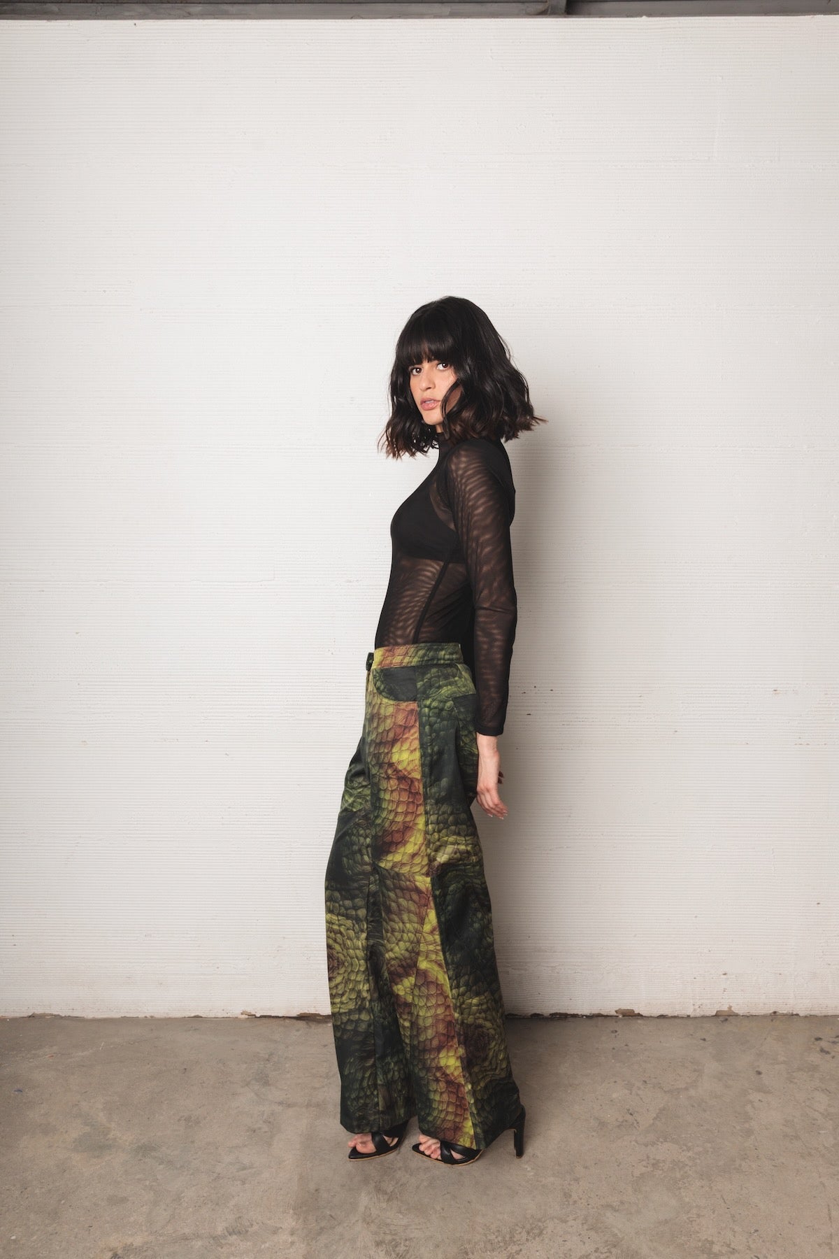 Mid-rise printed trousers with a relaxed and fluid silhouette. Stands out for its snake-type print in olive green and black tones with terracotta accents, which creates a deep and modern visual effect. The design features a straight and wide cut with a natural drape, providing movement and a sense of comfort. Includes discreet pockets that add functionality without interrupting the design.