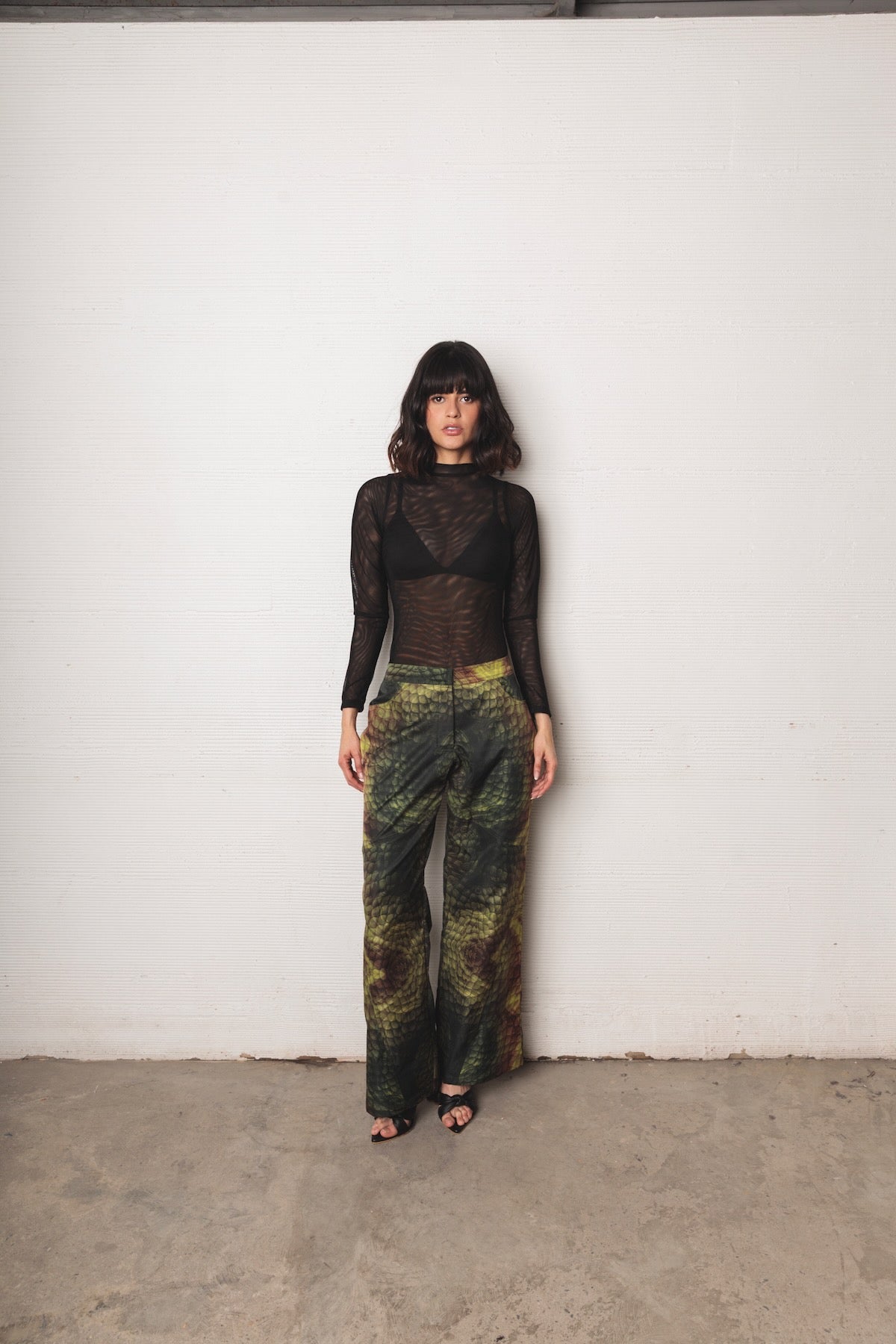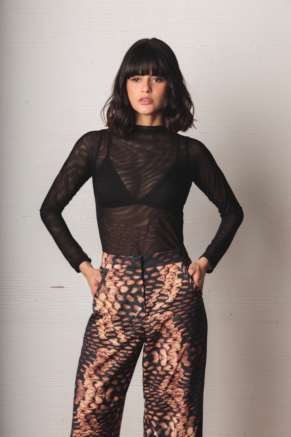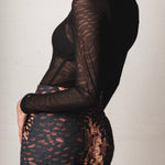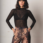 Long-sleeved mesh top, black color, its fitted silhouette highlights the figure, while the high neck provides an elegant and balanced touch.