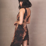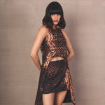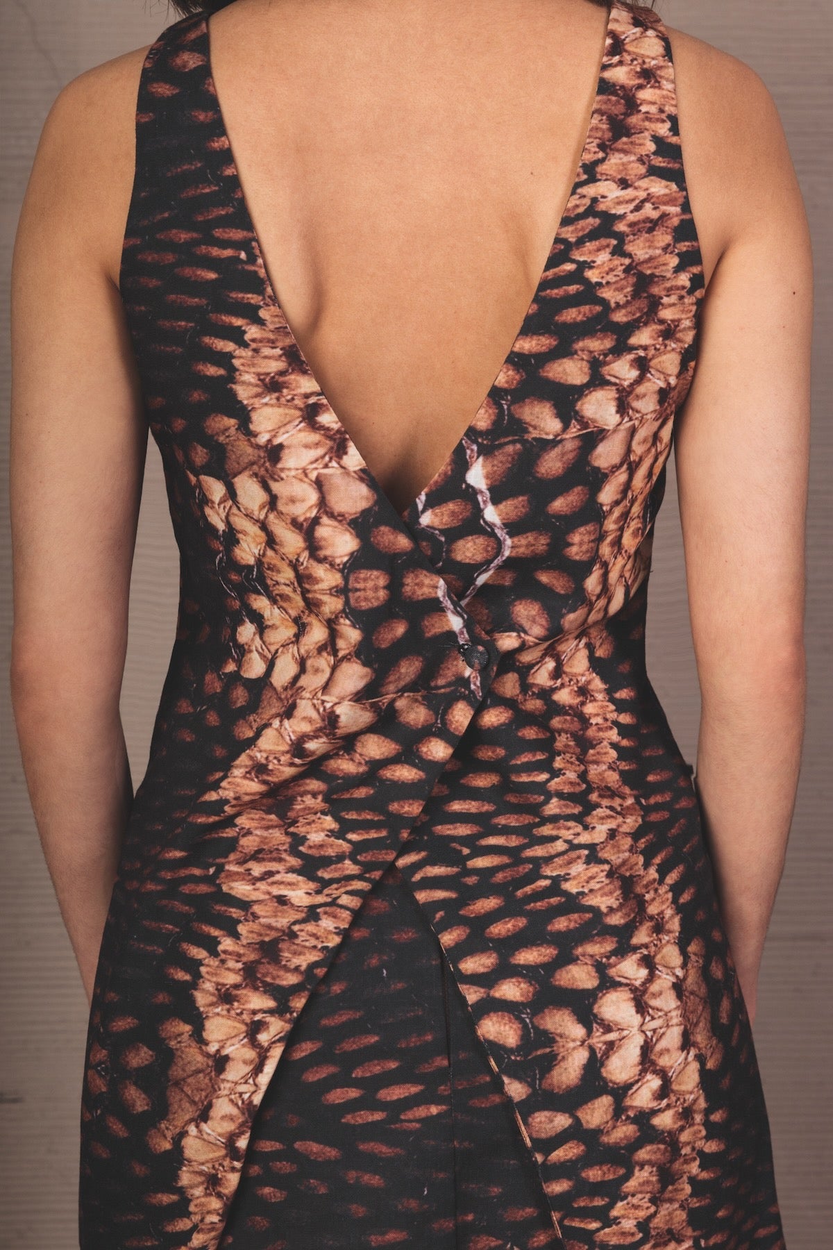 Asymmetrical sleeveless top, with snake-type print in caramel and black tones. Its design includes a curved front opening that subtly reveals the waist and a prolonged side drape that creates a short tunic effect.